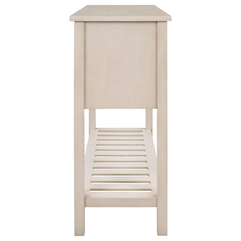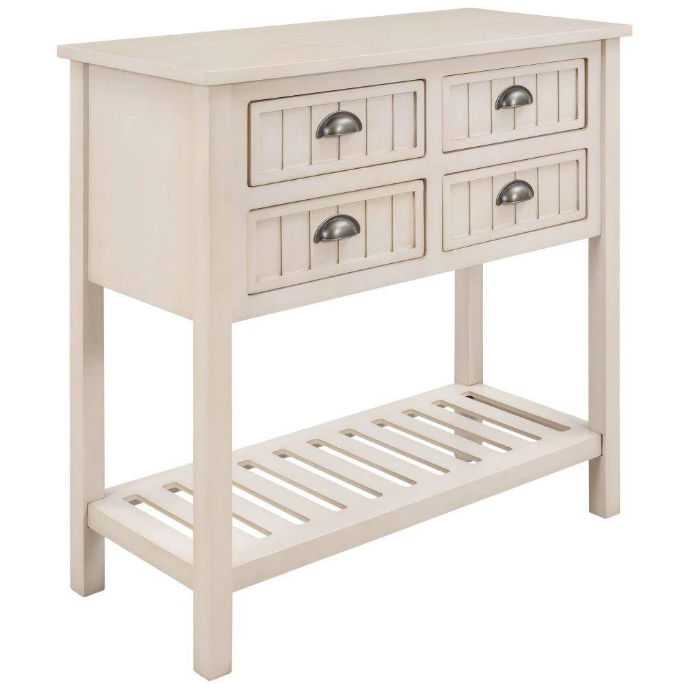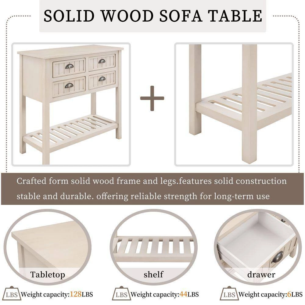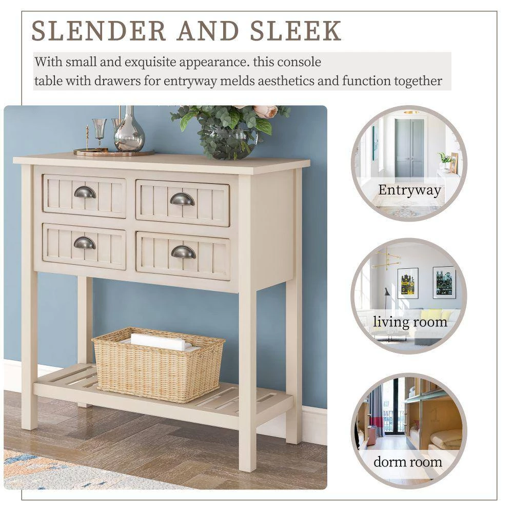 With small and exquisite appearance, this console table with-drawers for entryway melds aesthetics and function together. It can perfectly fit into smaller spaces like entryway, living room, dorm room. Crafted form solid wood frame and legs, this antique entryway table with-drawers and shelf features solid construction, stable and durable, offering reliable strength for long-term use. Features 4-storage drawers, open table top and the slatted lower shelf, this sofa table provides ample-storage space for your personal belongings. You can place things like lamps for extra lighting, decors for style, and store keys, coffee-cups and magazines in the 4-drawers. The bottom shelf is ideal for displaying baskets for toys and crafts. Each-drawer boasts a beadboard front, which adds a traditional texture to this console table. While the-cup style-drawer pull, crafted of metal, further enhances the retro and modern feel of this console table, creating a transitional and timeless look.