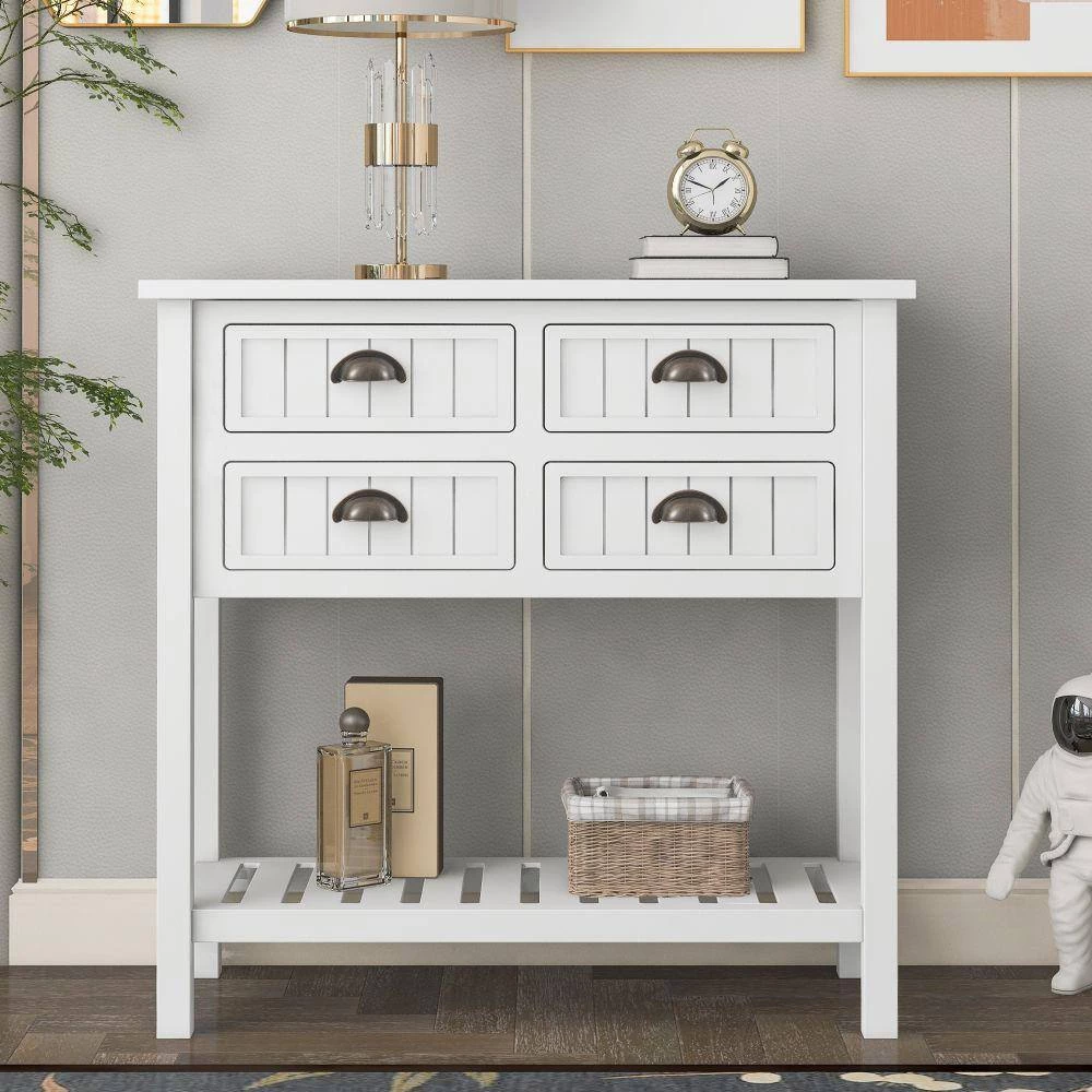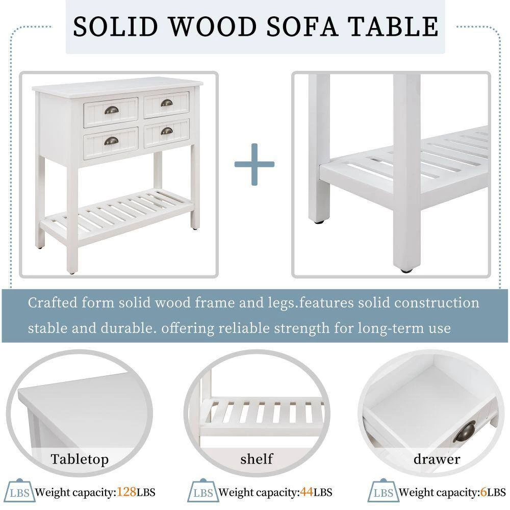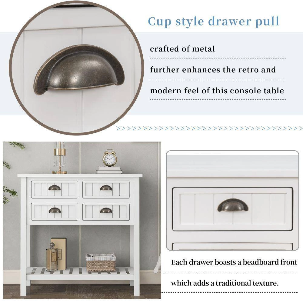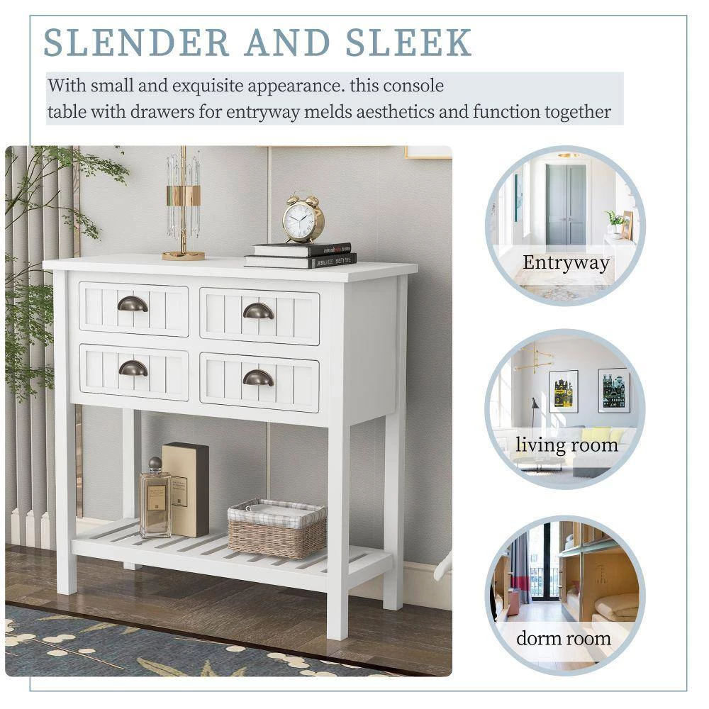 With small and exquisite appearance, this console table with-DRAWERs for entryway melds aesthetics and function together. It can perfectly fit into smaller spaces like entryway, living room, dorm room. Crafted form solid wood frame and-legs, this antique entryway table with-DRAWERs and shelf features solid construction, stable and durable, offering reliable strength for long-term use. Features four storage-DRAWERs, open table top and the slatted lower shelf, this sofa table provides ample storage space for your personal belongings. You can place things like lamps for extra lighting, decors for style, and store keys, coffee cups and magazines in the four-DRAWERs. The bottom shelf is ideal for displaying baskets for toys and crafts. Each-DRAWER boasts a beadboard front, which adds a traditional texture to this console table. While the cup style-DRAWER pull, crafted of metal, further enhances the retro and modern feel of this console table, creating a transitional and timeless look.