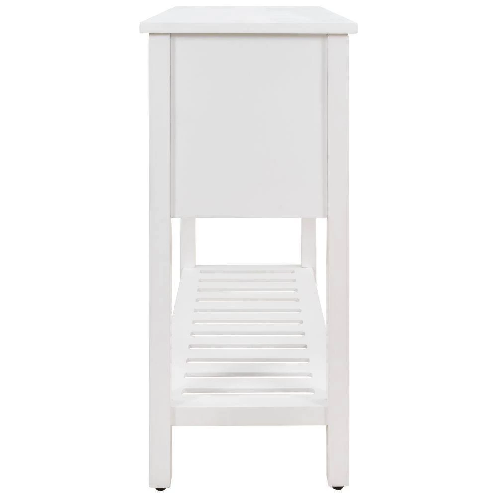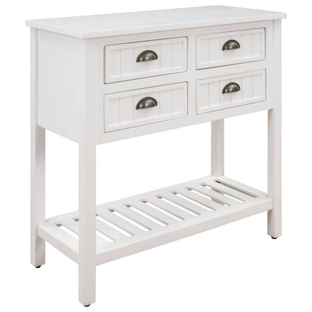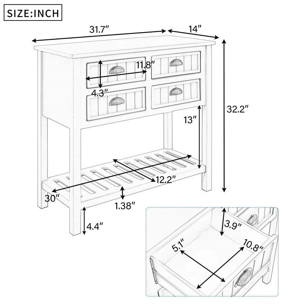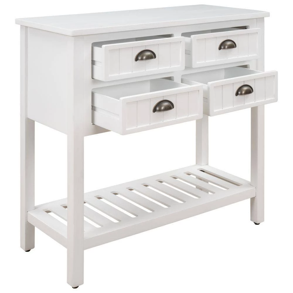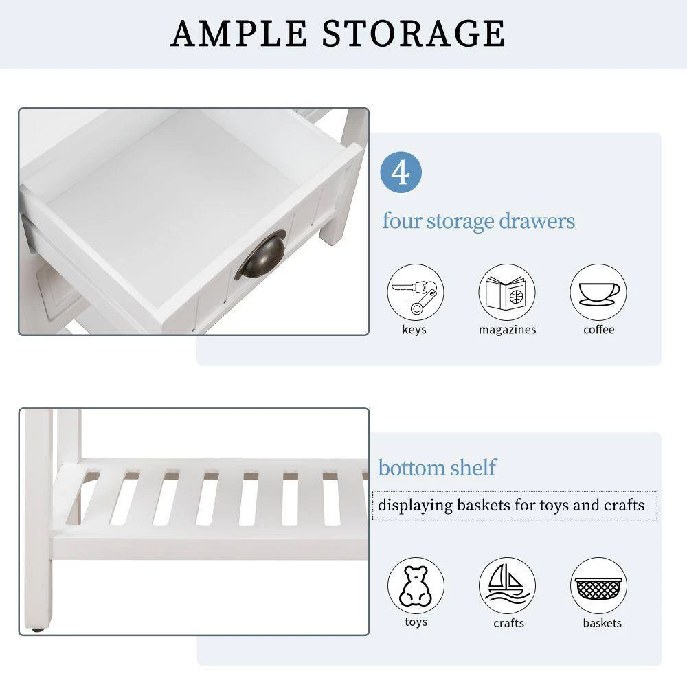 With small and exquisite appearance, this console table with-DRAWERs for entryway melds aesthetics and function together. It can perfectly fit into smaller spaces like entryway, living room, dorm room. Crafted form solid wood frame and-legs, this antique entryway table with-DRAWERs and shelf features solid construction, stable and durable, offering reliable strength for long-term use. Features four storage-DRAWERs, open table top and the slatted lower shelf, this sofa table provides ample storage space for your personal belongings. You can place things like lamps for extra lighting, decors for style, and store keys, coffee cups and magazines in the four-DRAWERs. The bottom shelf is ideal for displaying baskets for toys and crafts. Each-DRAWER boasts a beadboard front, which adds a traditional texture to this console table. While the cup style-DRAWER pull, crafted of metal, further enhances the retro and modern feel of this console table, creating a transitional and timeless look.