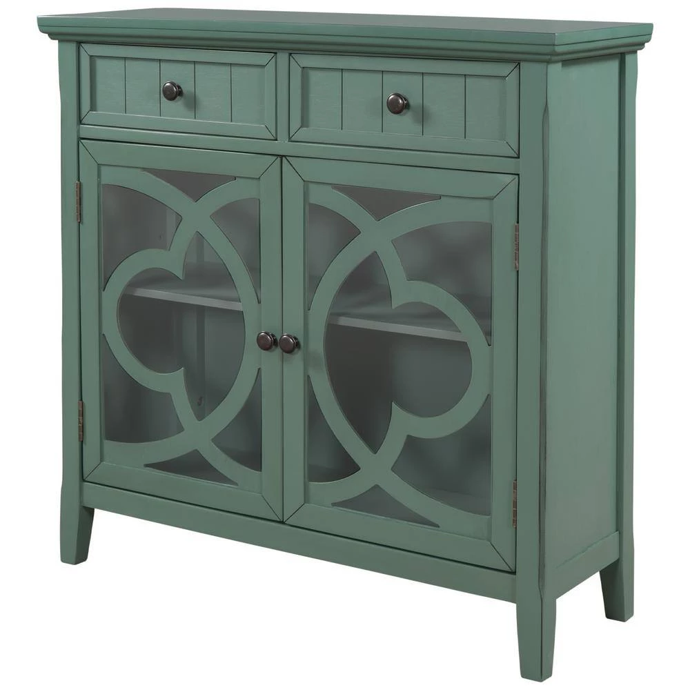 This 2 – Door Accent Cabinet with the fretwork doors,attractive and eye-catching,offers added storage in a space-saving design that is ideal for any size home.Made of MDF Veneer for top and acacia wood for framework and legs, the storage cabinet is built for long-lasting construction. With painted finish, the accent cabinet features a simple yet charming look. The shelf is adjustable to store your favorite decor and accessories. This combination of practical and ornamental design create a beautiful accent console cabinet that will complement any living room, dining room or hallway.