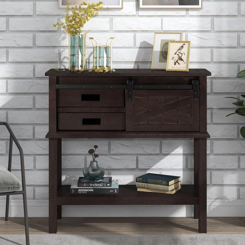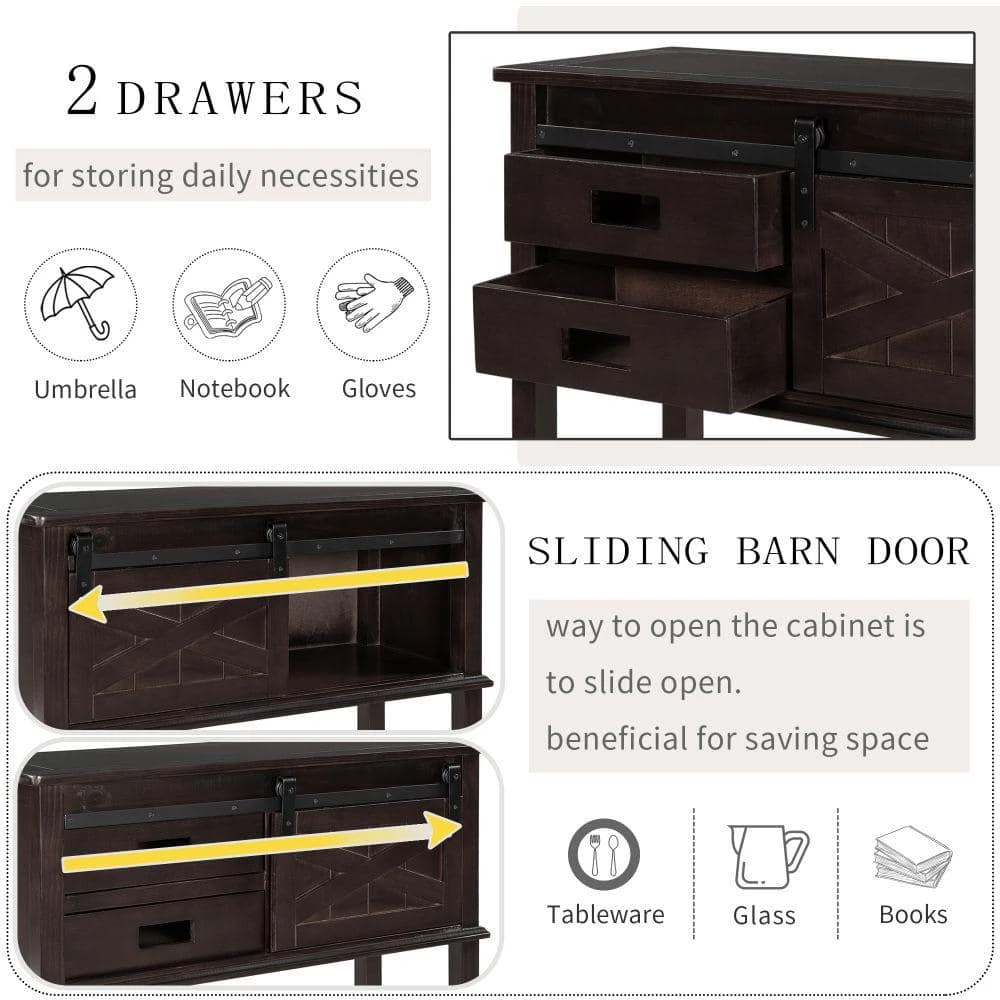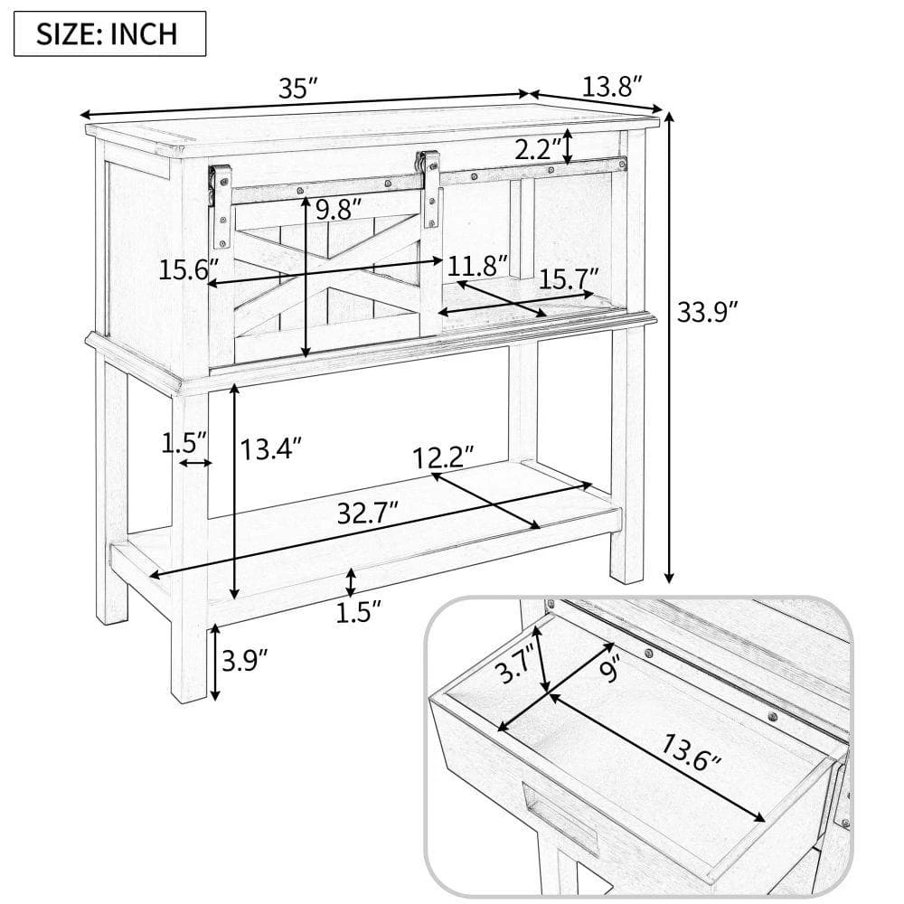 With the combination of retro elements and modern trend characteristics, this classic farmhouse style console table embodies the ingenuity of design. Stitched boards with X modeling elements bring the typical pastoral atmosphere to your house. The main body matches black slide equipment creates a visual impact, these-color combinations make you indulge in the most enduring aesthetics.For storing daily necessities and sundries, 2-drawers and a-cabinet are designed beneath the tabletop board and an open style shelf at the bottom. This design offer ample-storage space to keep daily supplies out of your sight. As a matter of interest, the way to open the-cabinet is to slide open, it’s a distinctive solution for-cabinet door opening. Certainly, such a different way to open the-cabinet is beneficial for saving space.Such a beautiful farmhouse style console table must be a long-term usage furniture as your wish, for that reason, this console table is manufactured with solid pine wood and iron. The pine wood is for the frame and legs, and the iron is for slide part. And spray paint on the surface of pine wood and iron ensures smooth touch feeling.