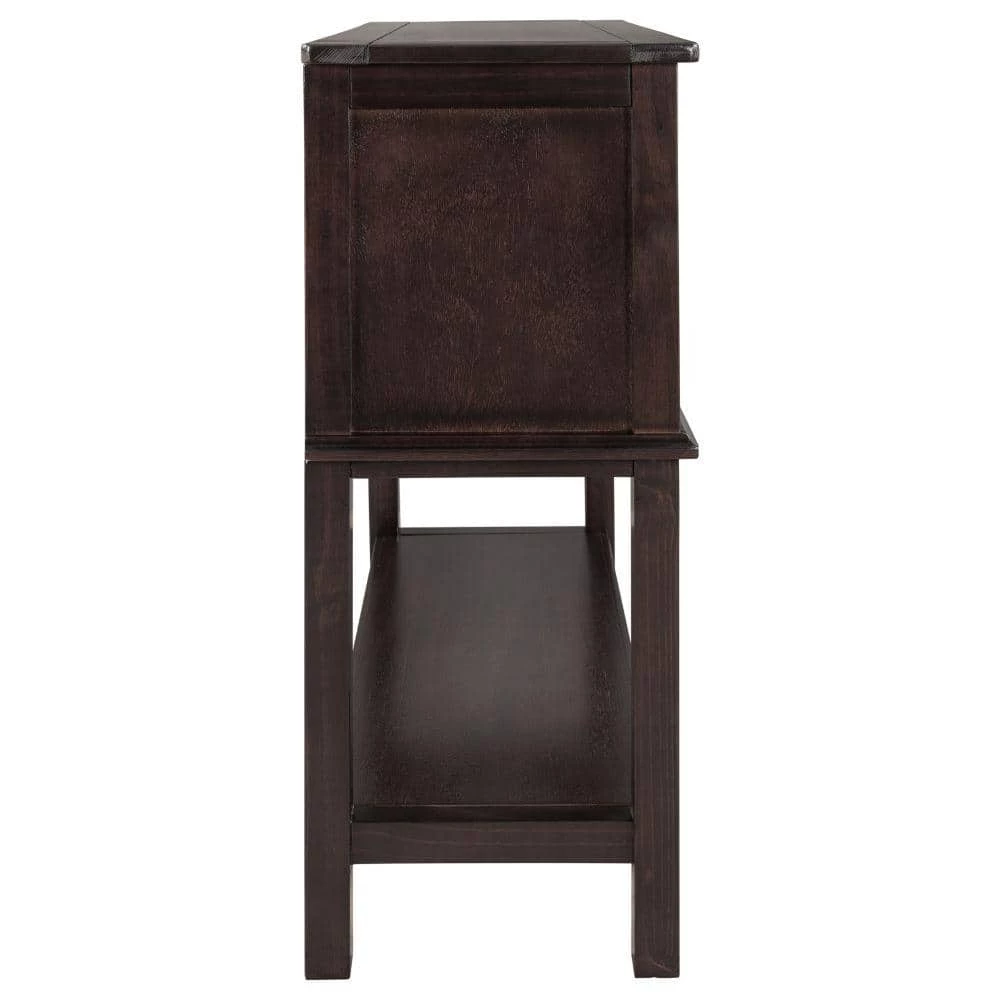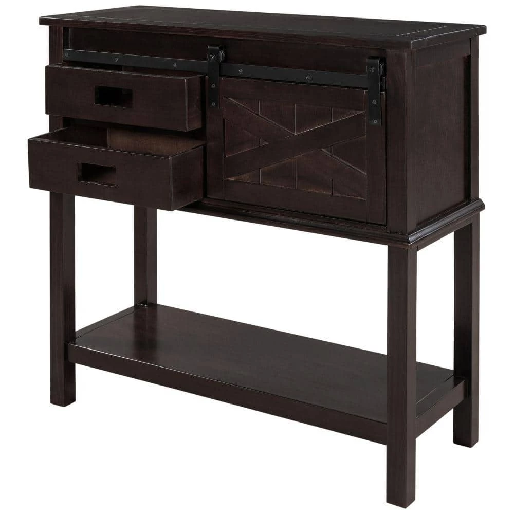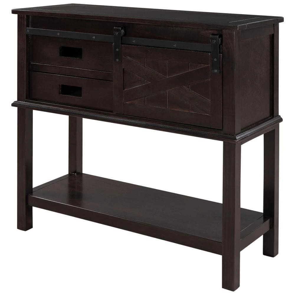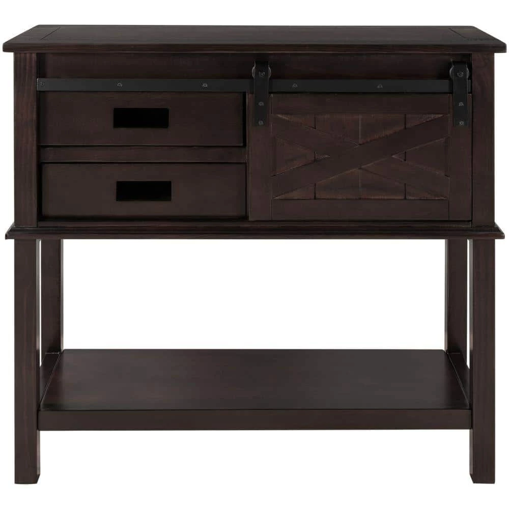 With the combination of retro elements and modern trend characteristics, this classic farmhouse style console table embodies the ingenuity of design. Stitched boards with X modeling elements bring the typical pastoral atmosphere to your house. The main body matches black slide equipment creates a visual impact, these-color combinations make you indulge in the most enduring aesthetics.For storing daily necessities and sundries, 2-drawers and a-cabinet are designed beneath the tabletop board and an open style shelf at the bottom. This design offer ample-storage space to keep daily supplies out of your sight. As a matter of interest, the way to open the-cabinet is to slide open, it’s a distinctive solution for-cabinet door opening. Certainly, such a different way to open the-cabinet is beneficial for saving space.Such a beautiful farmhouse style console table must be a long-term usage furniture as your wish, for that reason, this console table is manufactured with solid pine wood and iron. The pine wood is for the frame and legs, and the iron is for slide part. And spray paint on the surface of pine wood and iron ensures smooth touch feeling.