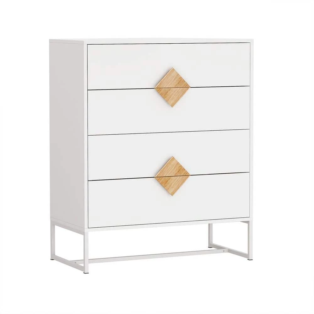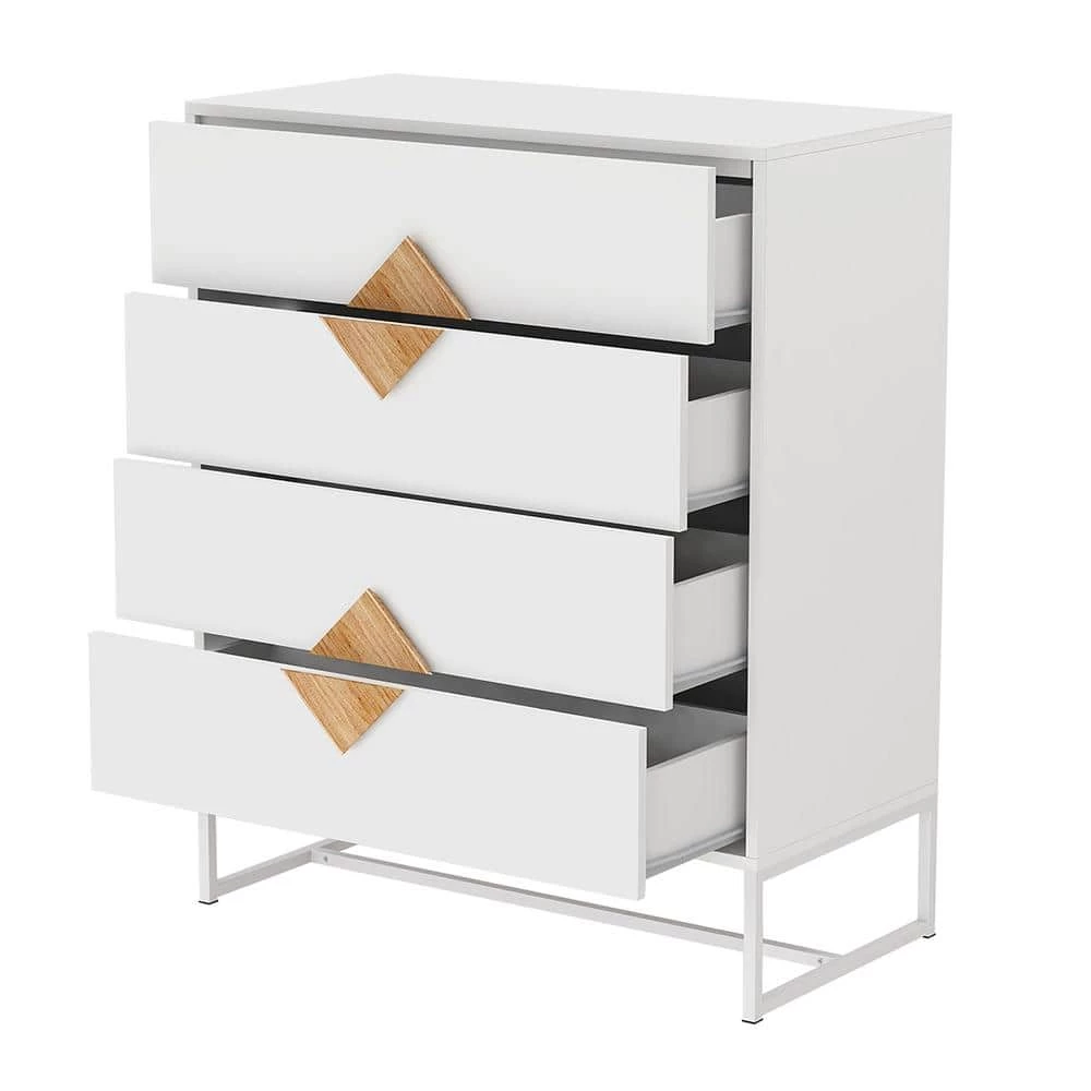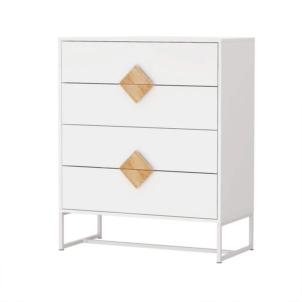 This bedroom dresser is made of E1 MDF and iron frame stand, can with stand a maximum 80 lb, drawers can hold 10 lb. It’s made of E1 MDF with UV painting surface, iron frame stand offers extra stable ability, works great as a wardrobe, dresser, cabinet etc.The metal slides makes pulling easier. 4 same size drawers you can use it as a bedroom dresser or a wardrobe, organize cloth and socks. Outstanding wooden handle with special shape-square, simple and versatile design use of various home decoration.