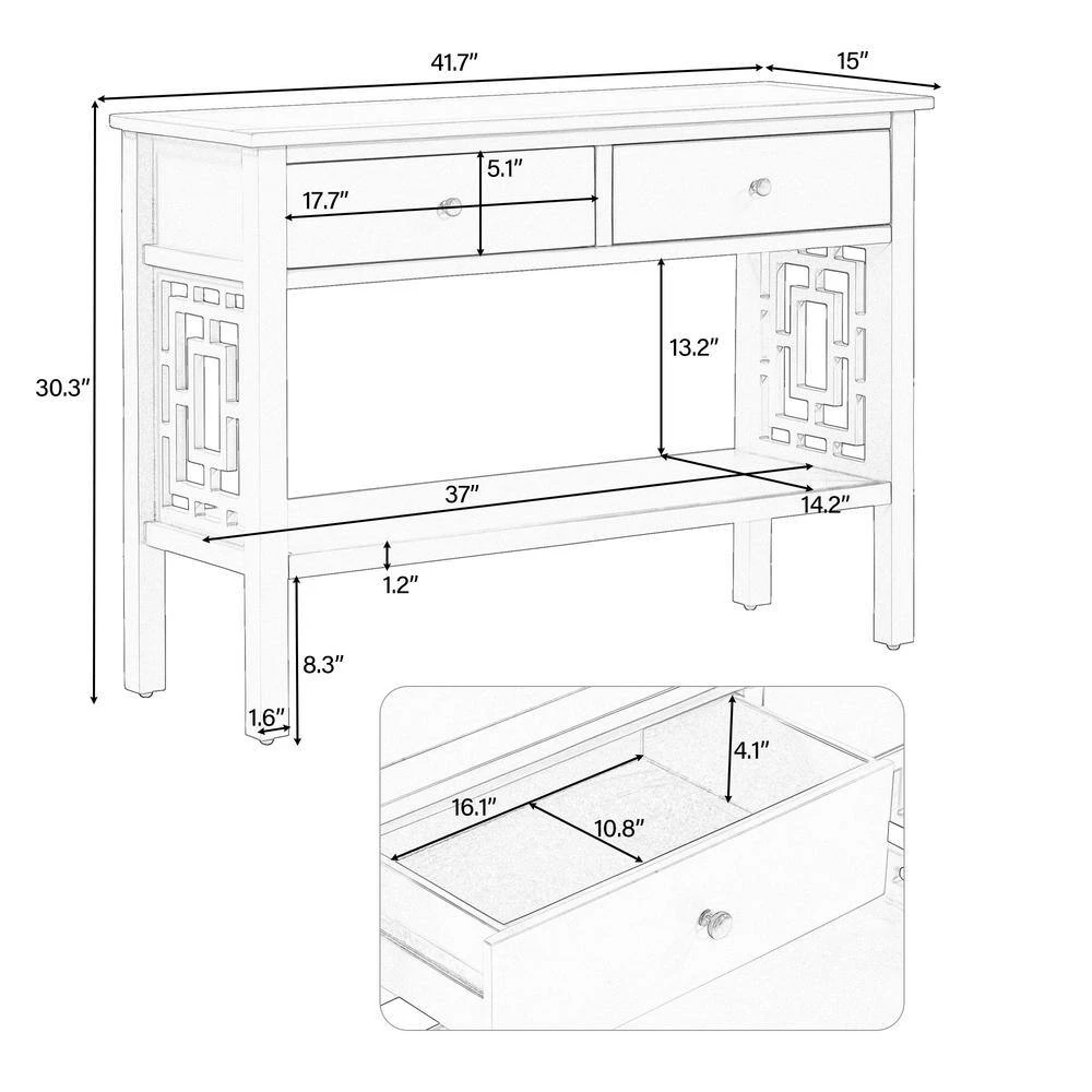 This side table is definitely the perfect choice for your home. The artistic retro design on both sides makes your side table extraordinarily beautiful and brings out the unique vision and taste of the owner of the house. Crafted with sturdy legs, this console table comes complete with two top drawers that open to hold your daily necessities and keeping them out of sight.Two-drawer and One open shelf allow for plenty of storage space for displaying framed photos, magazines, and other belongings. The polished surface of this console table feels smooth to the hand. Crafted with thick Pine and MDF wood and accented with quality Atimon handles, this table is suitable for stairs area, living room, bed room, and next to sofa.