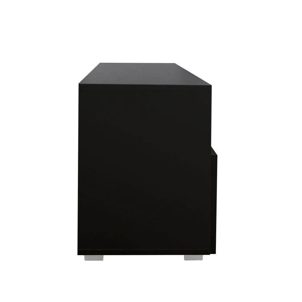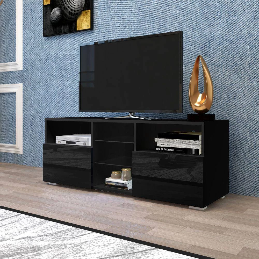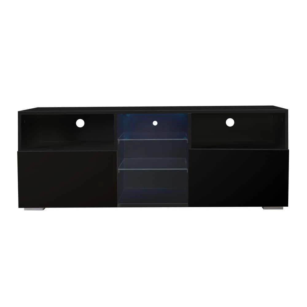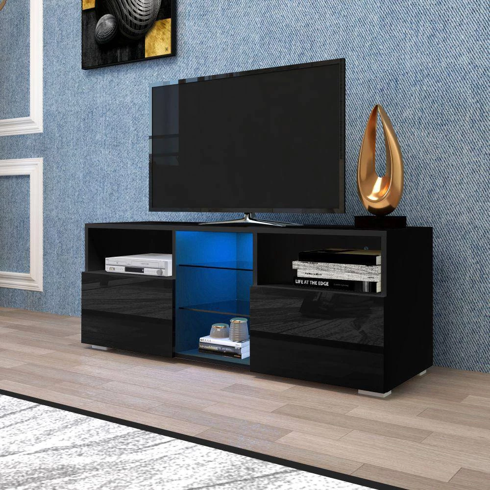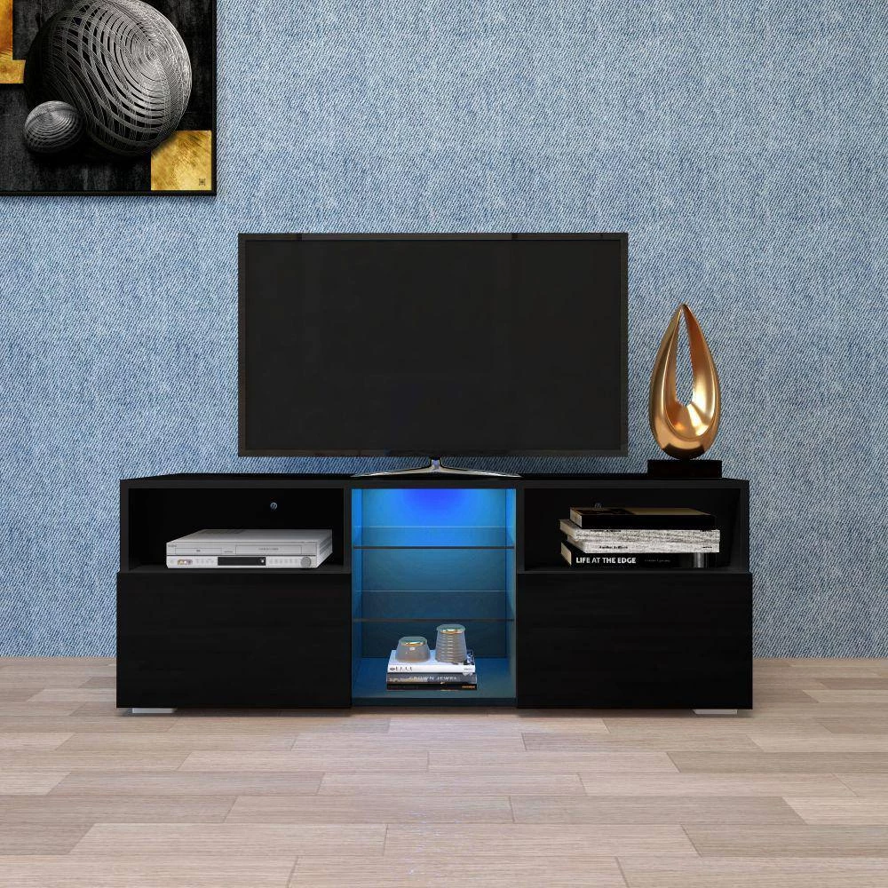 This TV stand has a modern and unique contemporary design. It is a perfect choice for those in need of living room storage space. TV Stand with 2-center-DRAWERs and open shelves for your gaming consoles. Modern Central entertainment features LED lights system for up to 55 in. TV Screens, elegant enough for adding special charm to your house.