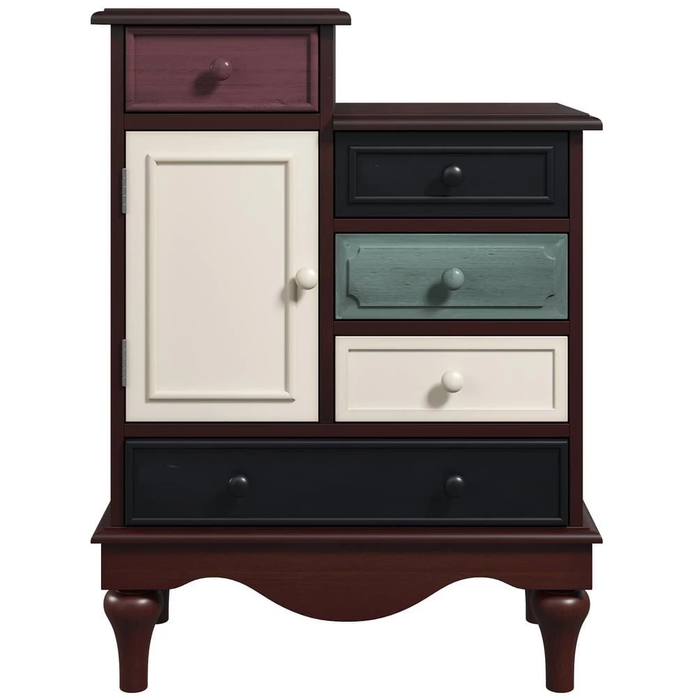This small cabinet has a retro old paint style, five colors of exterior so that his classic has some vitality, as if there are endless old stories, full of charm.High and low sitting tabletop is the unique design of this cabinet, streamlined wave base and four finely carved table legs, five drawers also use different craft lines, each detail reflects the professionalism and love of the craftsman. Featuring a solid wooden handle and rail, this small cabinet adds a high-grade and heavy feel to the furniture, and the wooden rails are retro and natural. Behind the door pressed with metal magnetic suction and hardware, very strong, the cabinet’s four legs are also screwed by long screws, after installed the cabinet is very strong and stable.