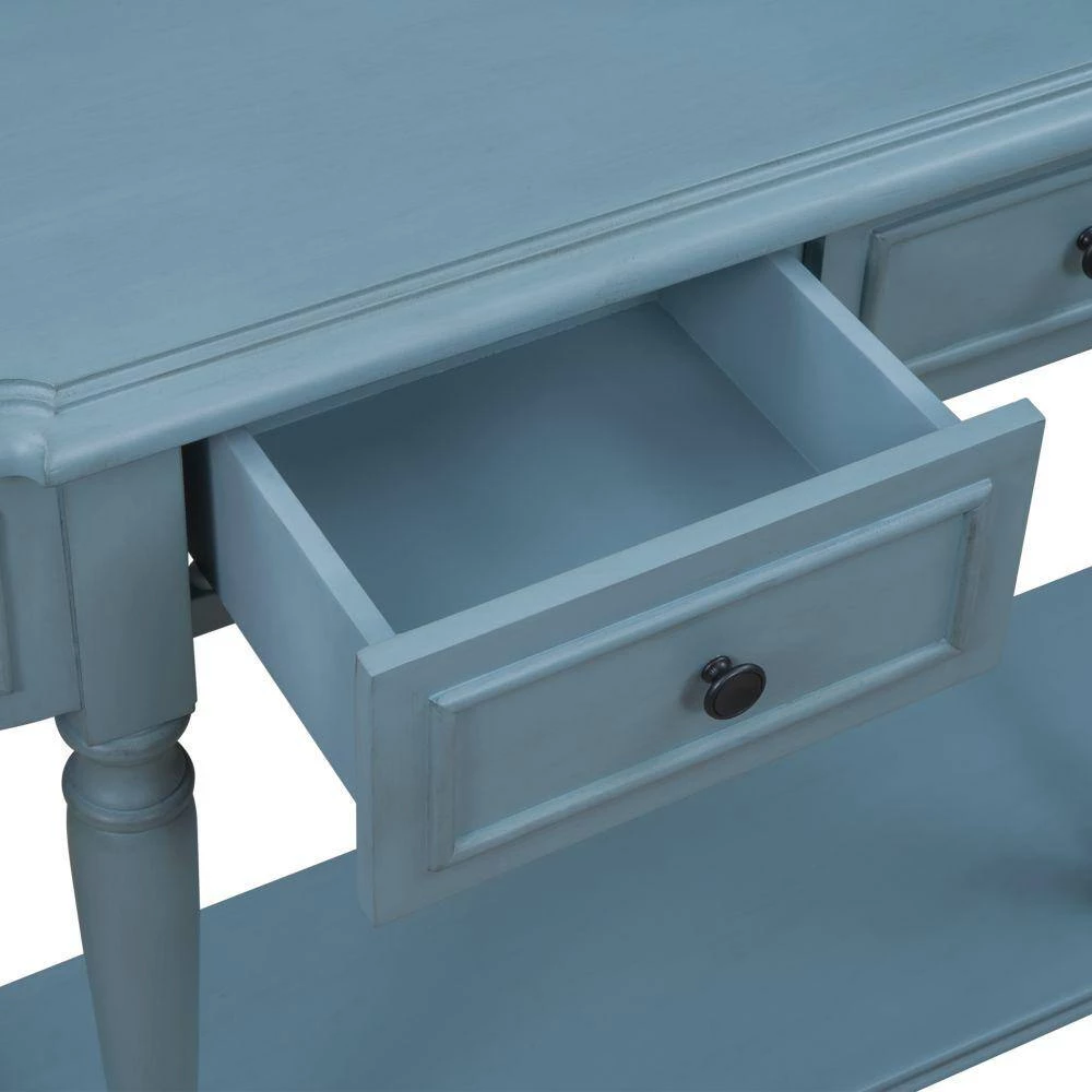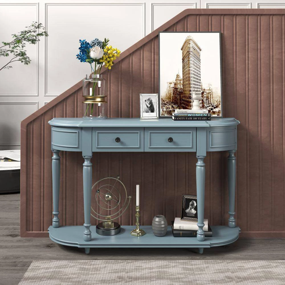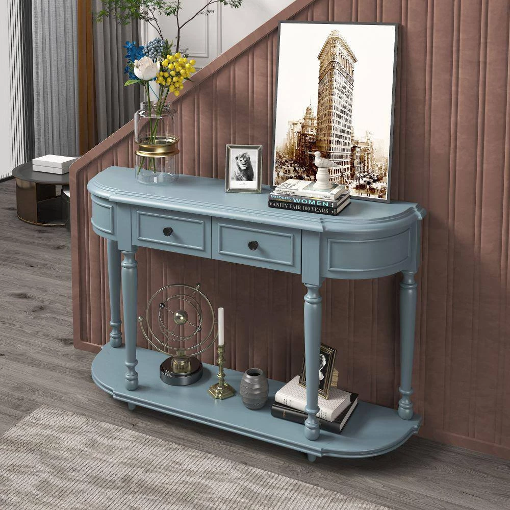 This elegant console table not only has classical looking, but also would be a stable and durable furniture in your usage. The frame of this console table is made of pine wood and the legs of it is made of acacia wood, with MDF boards as auxiliary material, this console table would be a long-term usage furniture with beautiful appearance. These conical table legs can offer sufficient load-bearing capacity to meet your daily needs for storage and decorations. This exquisite and compact console table offer large space to accommodate the daily necessities and decorations, though it would have made a fine ornament in itself. Tabletop, 2-top drawers and open style shelf can support delicate vase, lamp, storage basket, sundries, and etc. This retro design console table would be a useful furniture in your house. The load-bearing capacity of tabletop and bottom plate are 133 lbs. and 56 lbs. respectively. The amount of the same parameter of each top drawer is 11 lbs.
