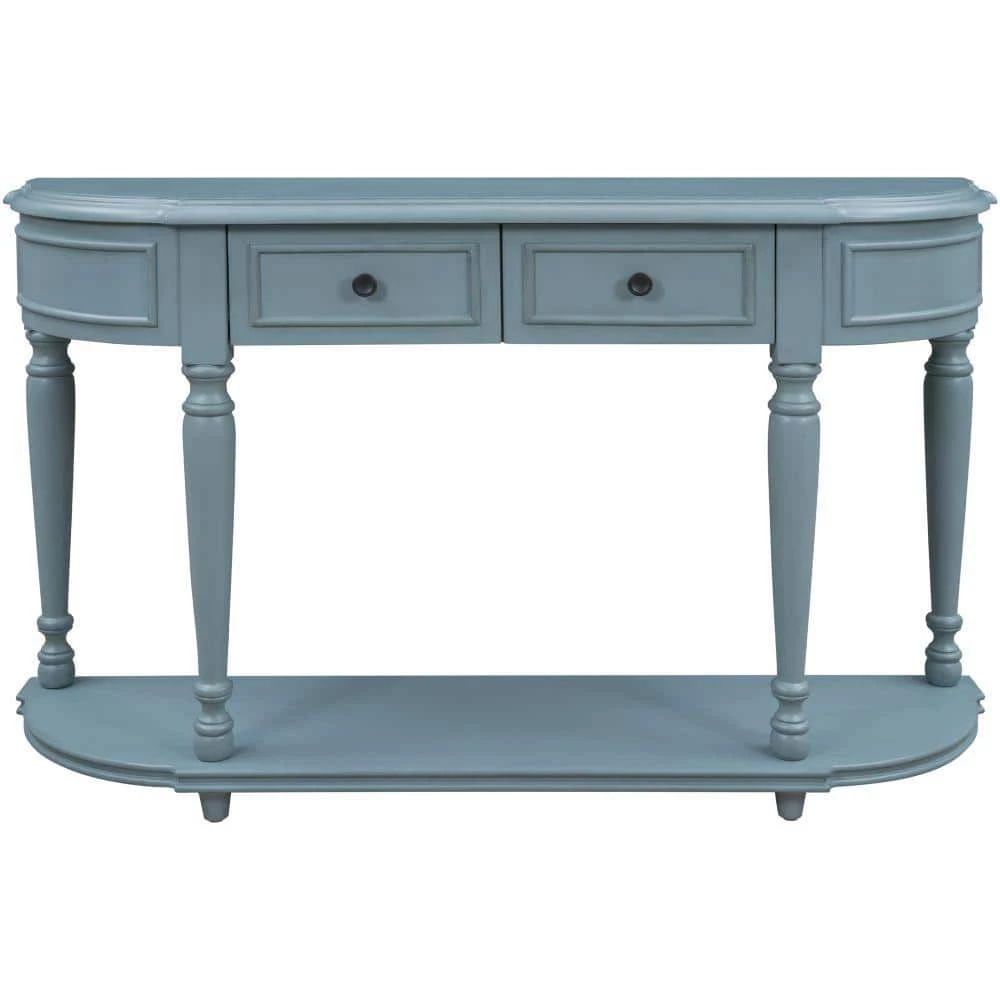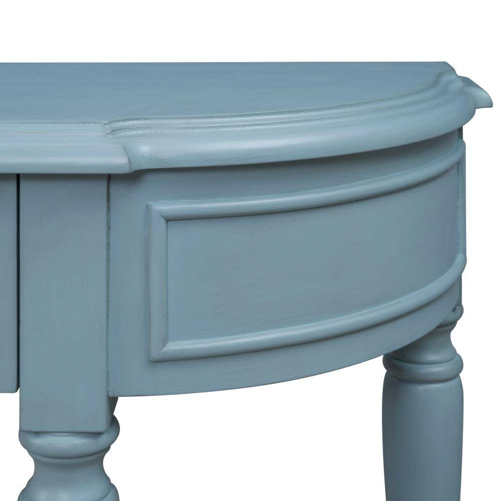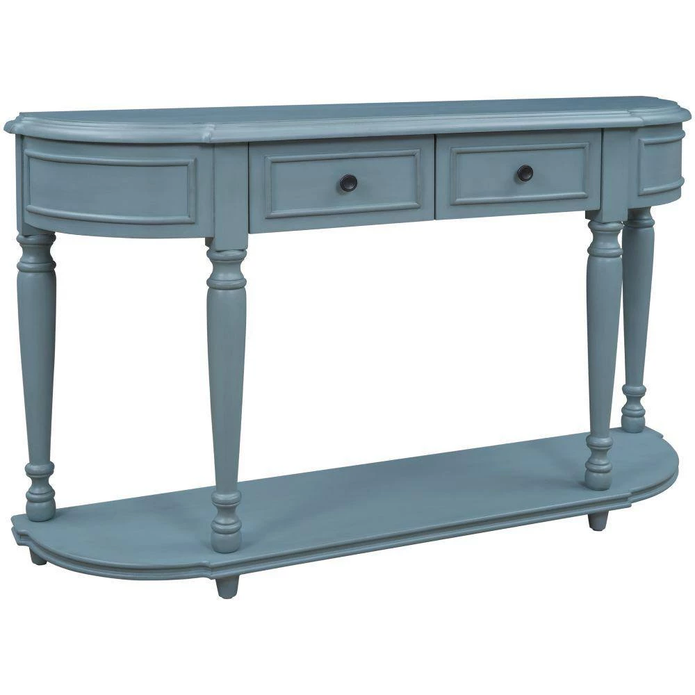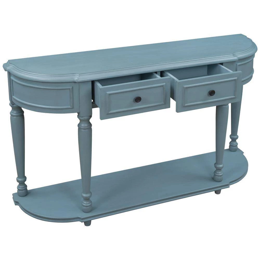 This elegant console table not only has classical looking, but also would be a stable and durable furniture in your usage. The frame of this console table is made of pine wood and the legs of it is made of acacia wood, with MDF boards as auxiliary material, this console table would be a long-term usage furniture with beautiful appearance. These conical table legs can offer sufficient load-bearing capacity to meet your daily needs for storage and decorations. This exquisite and compact console table offer large space to accommodate the daily necessities and decorations, though it would have made a fine ornament in itself. Tabletop, 2-top drawers and open style shelf can support delicate vase, lamp, storage basket, sundries, and etc. This retro design console table would be a useful furniture in your house. The load-bearing capacity of tabletop and bottom plate are 133 lbs. and 56 lbs. respectively. The amount of the same parameter of each top drawer is 11 lbs.