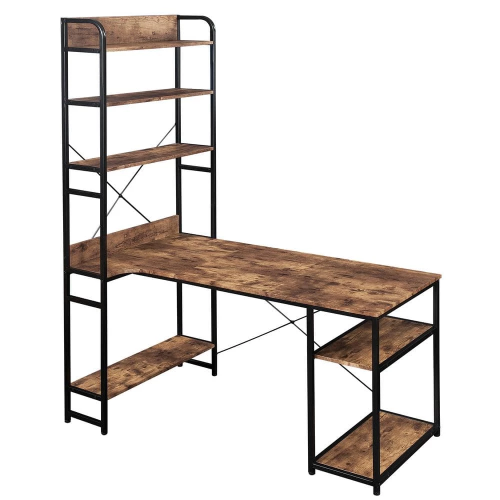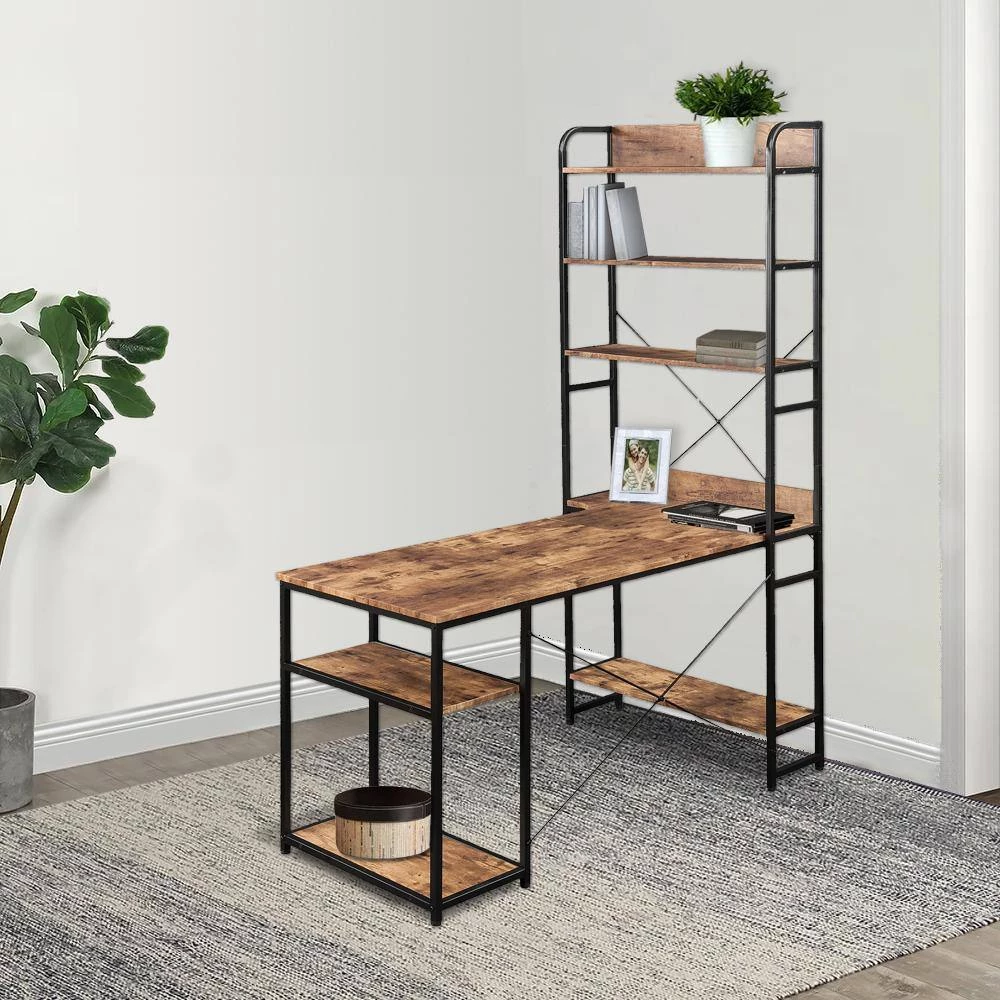 Five-Layer bookshelf design computer desk. Attached with open storage shelf, the writing desk enlarges storage place without occupying much floor space. The desk with bookshelf has large-capacity overall storage for all kinds of copiers, book magazines, office supplies, and computer mainframes.