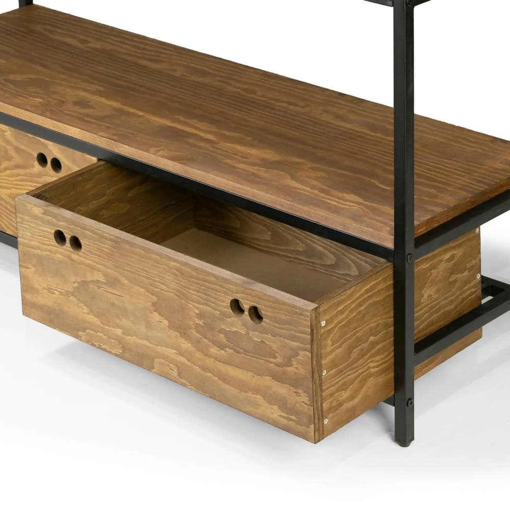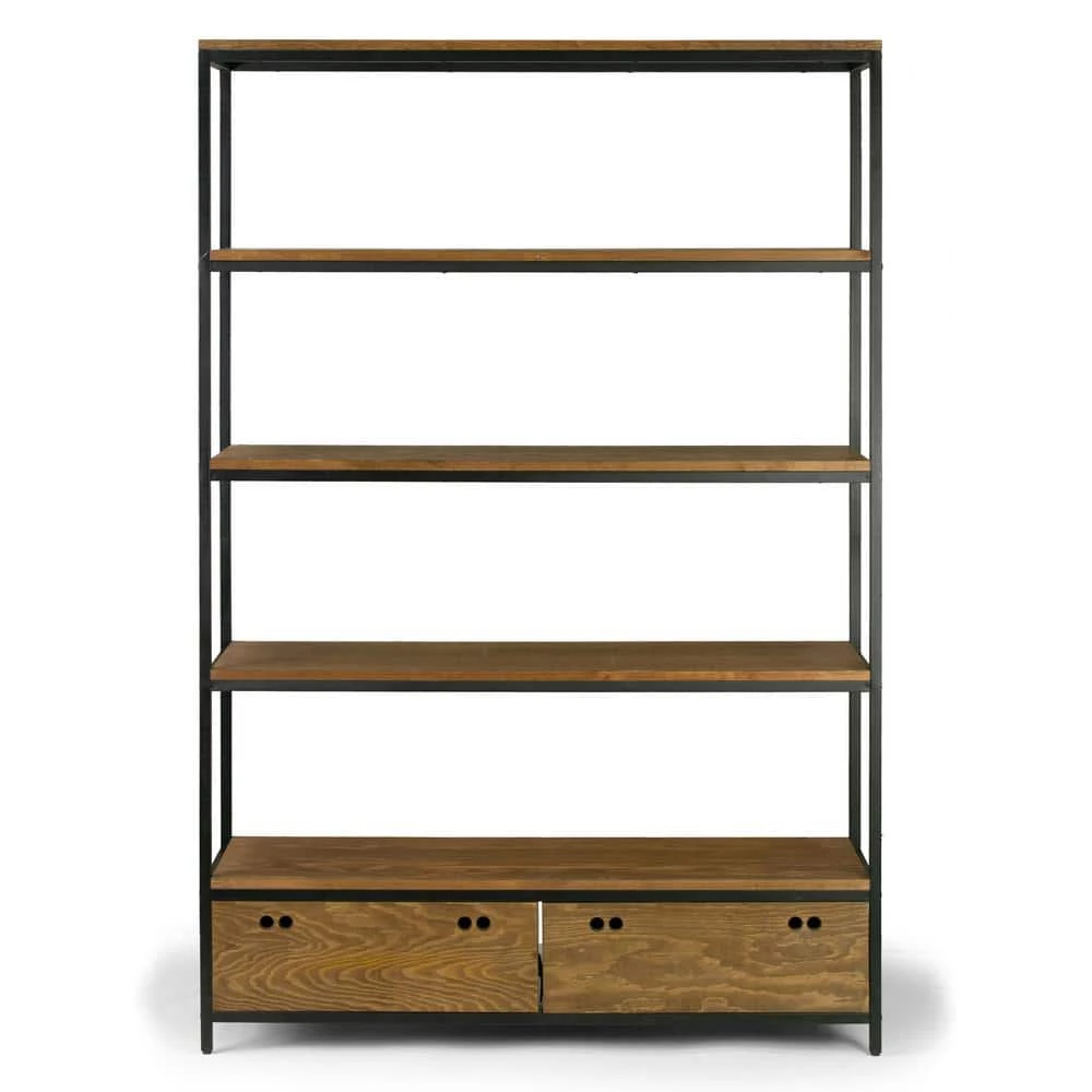 Chic, simple, versatile and durable, this etagere bookshelf has it all. Black metal frame and pine wood shelfing create a modern industrial look, provide generous storage space and add style to your room. Two bottom drawers, made of pine wood veneer over high quality MDF, offer better organization space. All shelves are made of pine wood. Assembly is needed. Clean with dry cloth recommended. Features: Pine wood shelves Pine wood veneer over MDF drawers Five full shelves 2-bottom drawers Black metal frame Weight capacity 70 lbs. per shelf spread evenly Assembly required Product Dimensions: 47.25 in. W x 15 in. D x 70.75 in. H Weight: 101 lbs., shelf: 45.75 in. W x 15 in. D, 0.75 in. thick; Between shelves: 13 in. clearance; Legs: 2.5 in. H (from bottom of the shelving to the floor); Drawer inside: 21.625 in. W x 13.375 in. D x 7.125 in. H.