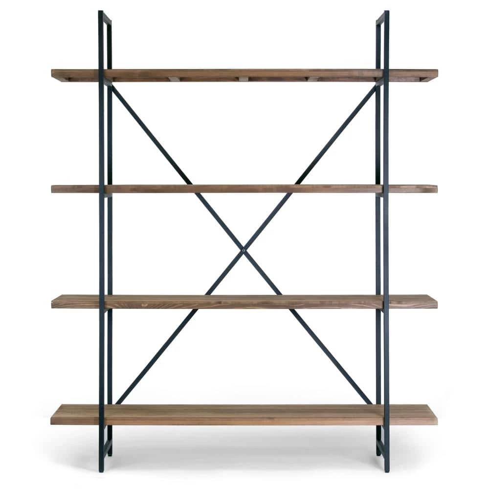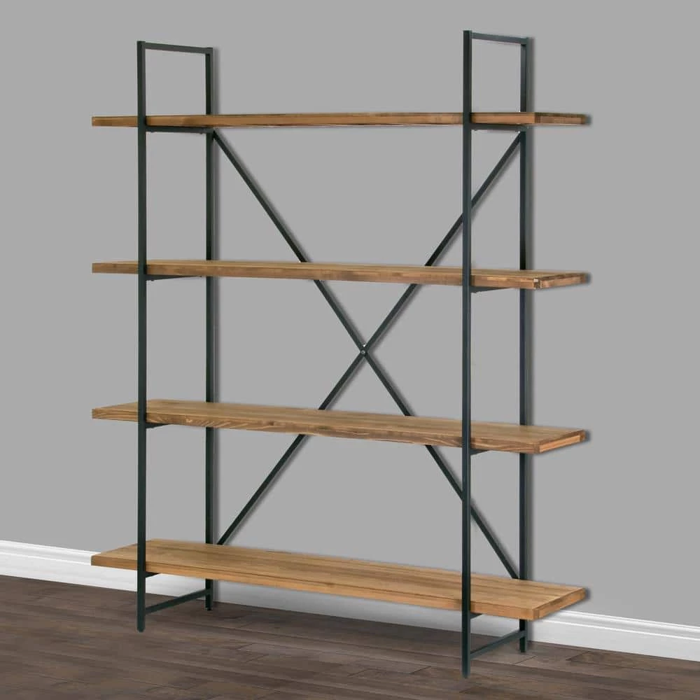 Chic, simple, versatile and durable, this etagere bookcase has it all. Black metal frame and four full shelves made of pine wood create a modern industrial look, provide generous organization space and add style to your room. Assembly is needed. Clean with dry cloth recommended. Features: Brown pine wood shelves Walnut color finish Black metal frame Four full shelves Assembly needed Clean with dry cloth Assembly required Product Dimensions: 63 in. W x 15.75 in. D x 75 in. H Weight: 43 lbs. Shelf: 63 in. W x 14 in. D x 1.375 Thick; Between shelves: 18.875 in. ; Top: 65.75 in. H from floor; 2nd: 46.75 in. H; 3rd: 27.75 in. H; Bottom: 8.875 in. H; Leg height: 7.5 in. from floor; shelf width beyond metal frame: 7.75 in. each side.