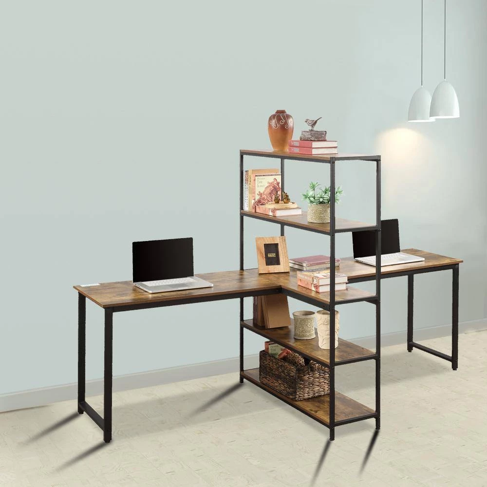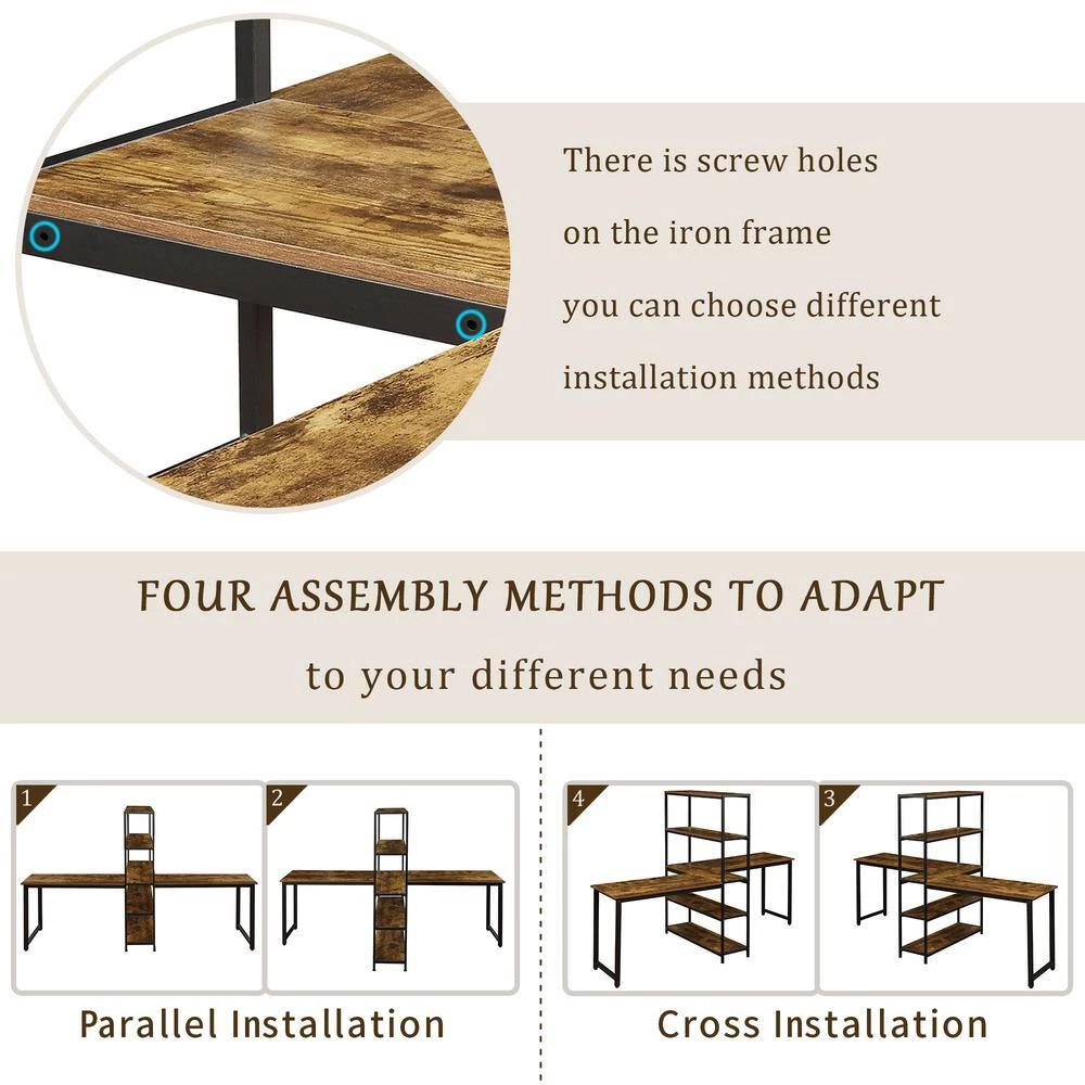 There are four installation methods for this desk. You can install two desktops in parallel or cross.The 90 Inch – Length size allows 2 person to work side by side without compromising on space; The unique bookshelf design provide spacious space for storage while create two non-interference independent workspace that makes it’s space-saving and much more effective.In addition.In addition, this desk can choose to install only one side of the desk, which can be used as a single desk.