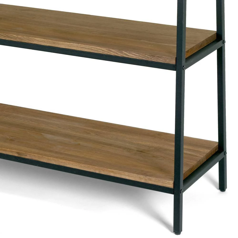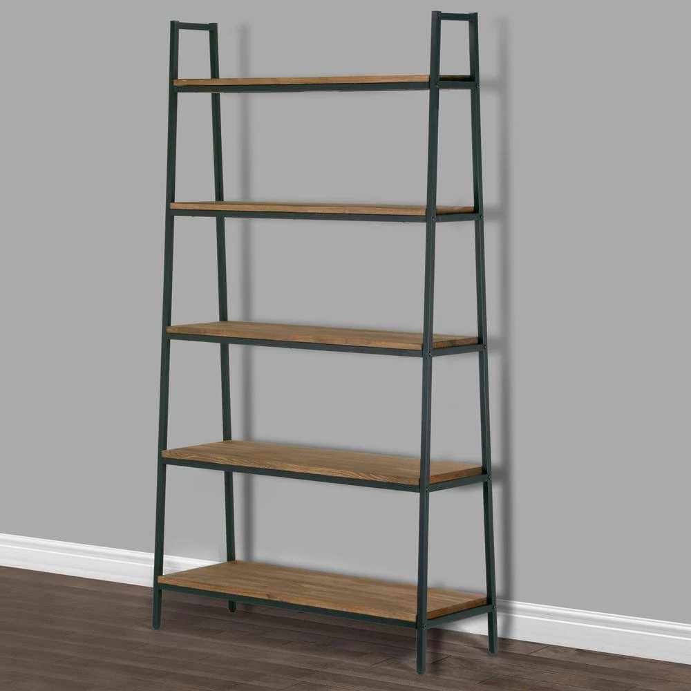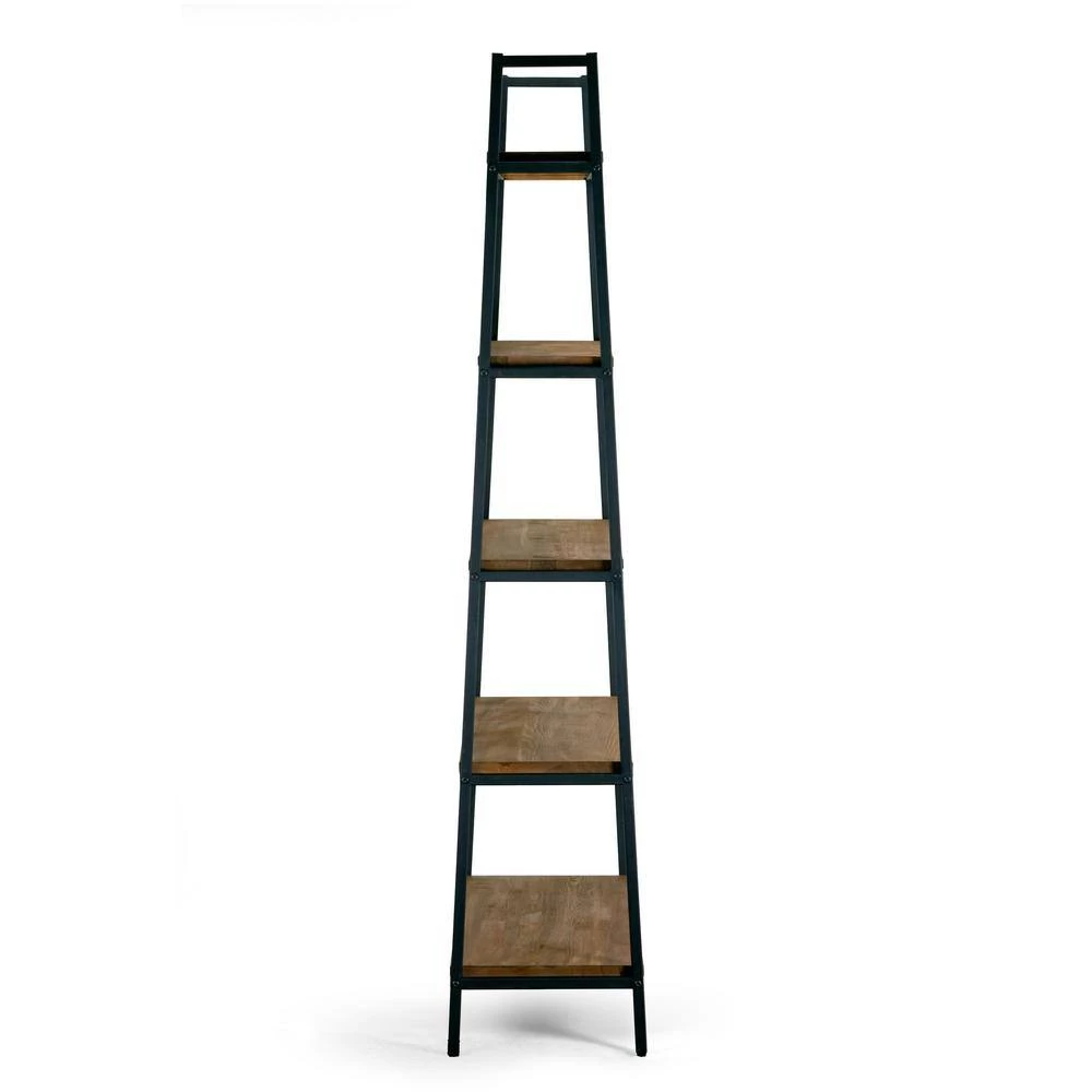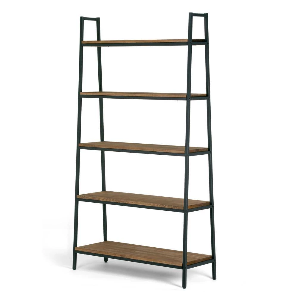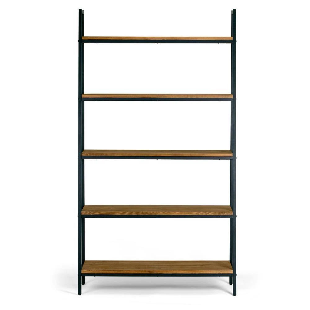 Chic, simple, versatile and durable, this etagere bookcase has it all. Black metal frame and 5-full shelves made of pine wood create a modern industrial look, provide generous organization space and add style to your room. Assembly is needed. Clean with dry cloth recommended. Features: Pine wood shelves Walnut color finish Black metal frame 5-full shelves Clean with dry cloth Assembly required Product Dimensions: 39.5 in. W x 14.25 in. D x 71.5 in. H Weight: 55 lbs., Shelf: 1.5 in. thick; In between shelves: 13 in. ; Bottom: 37.75 in. W x 13.875 in. D x 6.25 in. H; 2nd: 37.875 in. W x 12.5 in. D x 20.75 in. H; 3rd: 37.875 in. W x 11 in. D x 35.375 in. H; 4th: 37.875 in. W x 9.75 in. D x 50 in. H; Top: 37.875 in. W x 8.25 in. D x 64.5 in. H.