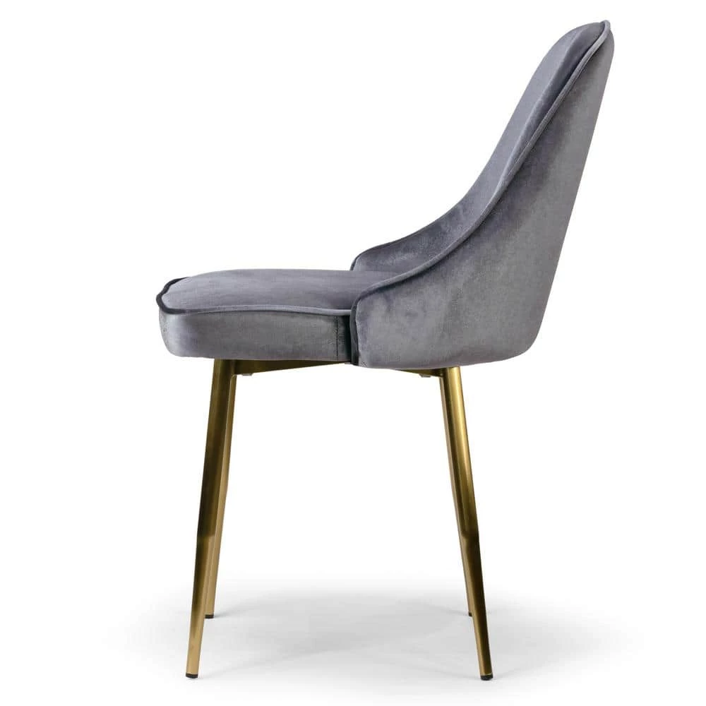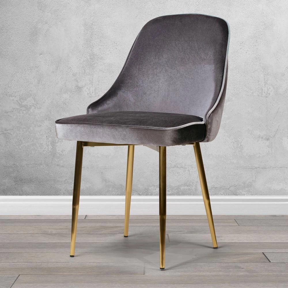 Sandy brown velvet upholstered chair with brushed golden steel legs. Sandy brown velvet with purple undertone and brushed golden finish refresh the classic dining chair design with a touch of glamour. This would be the choice for you if you are looking for a unique and yet classic piece of furniture. While superb craftsmanship materializes the look, quality metal frame claims sturdiness and durability. Floor protectors included. Easy assembly. Spot clean recommended. Features, sandy brown with purple undertone velvet upholstery brushed golden steel legs floor protectors included easy assembly assembly required product dimensions, 20 in. W x 24 in. D x 34 in. H weight, 13 lbs. seat, 20 in. W x 18.5 in. D x 20 in. H, seat cushion, 3 in. thick, back, 18 in. W x 5 in. D x 14 in. H, back cushion, 3 in. thick, legs, 17 in. H.