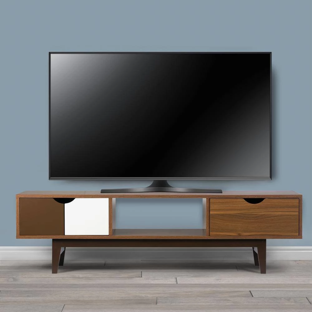 Modern Scandinavian style walnut finish TV Stand with contrasting colored drawers. Clear-cut lines are simple yet elegant. Differently colored drawers make this TV stand more interesting than just a classic. Two drawers with one open shelves provide organization options. This TV stand is made with wood veneer over high quality MDF for the frame and solid wood for the legs. This TV stand can accommodate up to 70 in. TVs. Floor protectors available. Assembly needed. Wipe clean with a dry cloth. Features: Scandinavian style Contrasting colors High quality MDF frame Rubber wood legs 2 drawers for storage Assembly required Product Dimensions: 63 in. W x 15.75 in. D x 17.625 in. H Weight: 82.5 lbs.. Legs: 8 in. H; Drawer inside: 17.125 in. W x 11.25 in. D x 6 in. H; Middle shelf inside: 20.75 in. W x 15.75 in. D x 8.375 in. H; Cabinet inside: 19.5 in. W x 14.25 in. D x 8.375 in. H; Table top: 0.75 in. thick.