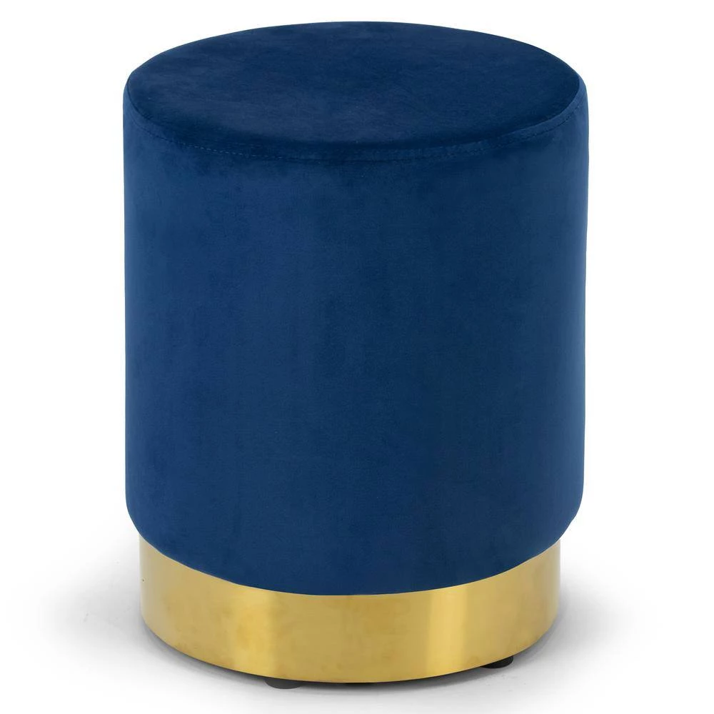 This round ottoman can be a versatile addition to your room. It can be used as a footstool or a petite sitting option. Blue velvet upholstery is classy while the golden metal accent wrap around the lower part the ottoman adds the delicacy of modern details. The round shape is kid-friendly as well as space-saving. This item comes fully assembled. Spot clean recommended. Features: Round footstool ottoman. Blue velvet upholstery. Golden metal base accent. Floor protectors come attached to the base. Product Dimensions:13 in. W x 13 in. D x 16.5 in. H Weight: 7 lbs. Base (golden accent part): 12 in. W x 12 in. D x 3.25 in. H; Top foam cushion: 1.5 in. H.
