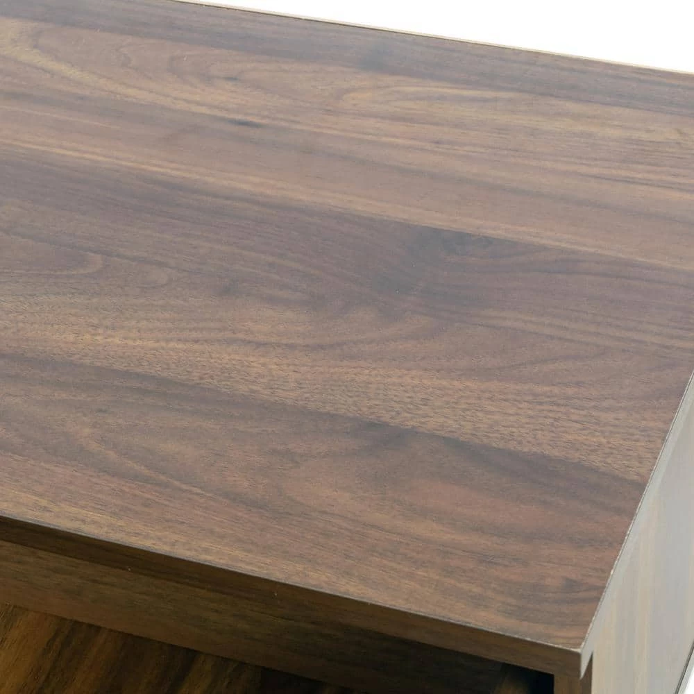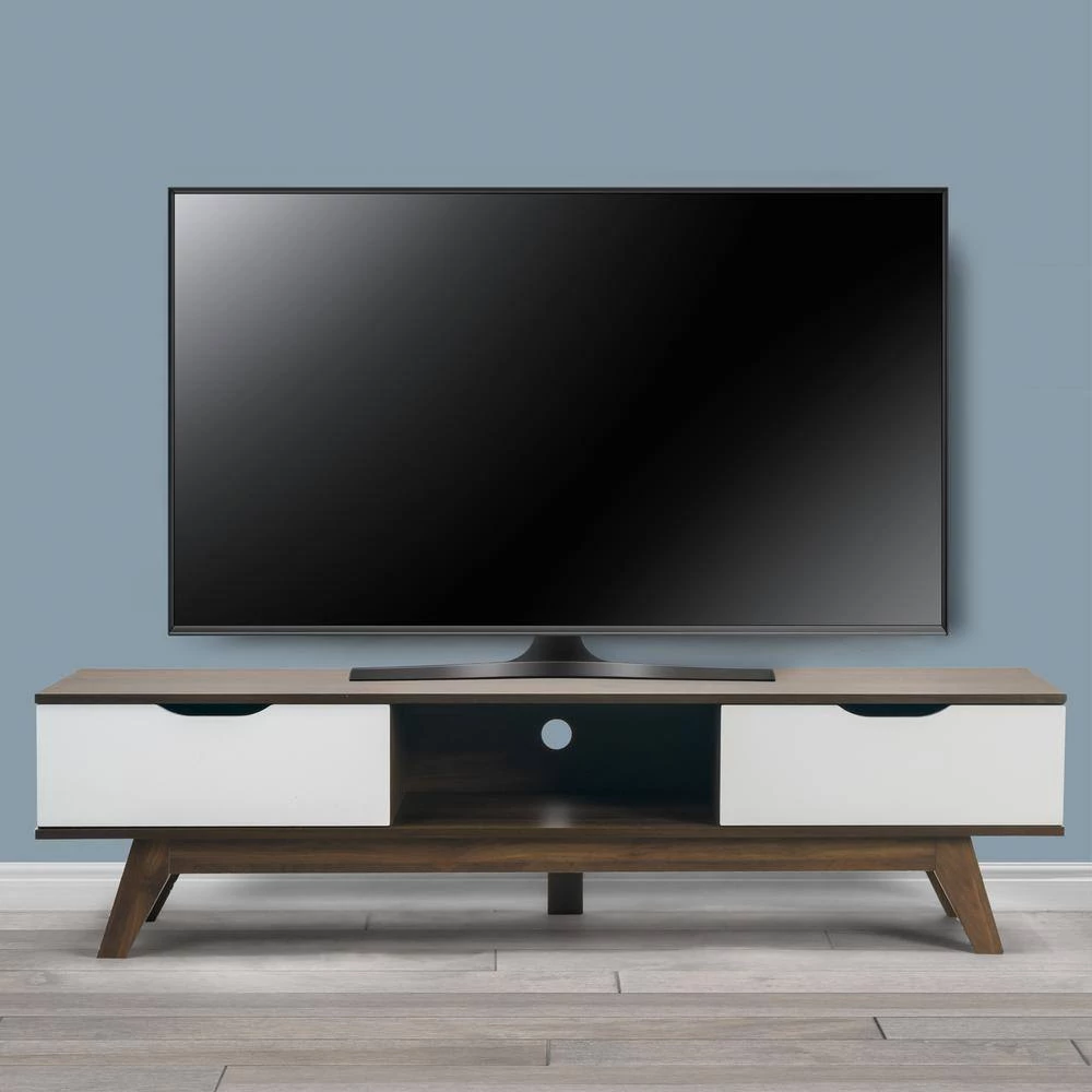Clear-cut lines and contrasting color make this TV stand simple yet sophisticated. Scandinavian design, walnut and white finish, two drawers and two open shelves make the TV stand a product with both style and utility. Assembly needed. Wipe clean with a dry cloth. Features: Two drawers One open shelves. Contrasting walnut and white finish. Walnut finish legs. Cable hole on the backing for easy wiring. Assembly required. Product Dimensions:63 in. W x 16 in. D x 16.625 in. H Weight: 70 lbs. Drawers inside: 18 in. W x 12.5 in. D x 6.25 in. H; Shelf: 20 in. W x 15 in. D x 7.625 in. H; Legs: 7.625 in. H. Boards: 0.625 in. thick.