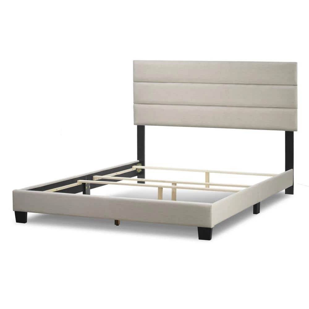 A simple yet classic design with updated details. This bed is minimalist and chic. Neutral color scheme will beautifully match other pieces in your bedroom. Rubber wood frame offers quality for use, while line stitching tufting adds characteristics. This bed ships fast and all parts come in one box. You will need a box spring for better support of your mattress. Assembly required. Spot clean recommended. Features: Beige fabric upholstery Rubber wood frame Line stitching tufting Box spring required Spot clean recommended Assembly required Product Dimensions:62.75 in. W x 83 in. D x 49 in. H Weight: 55.12 LBS Headboard: 62.75 in. W x 2.5 in. D x 24 in. H, Footboard: 62.75 in. W x 2.5 in. D x 10 in. H, Sideboard: 80.5 in. L x 1 in. D x 10 in. H, Foot: 3 in. W x 1.25 in. D x 3.75 in. H, Inside frame space: 60.25 in. W x 80.5 in. D, Gap between bottom frame and top of sideboard: 1 in. H, Gap between bottom frame and bottom of headboard: 16 in. H, Bottom of headboard to floor: 25 in. H.