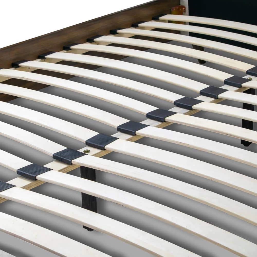 A classic design with updated modern details. Neutral color scheme will beautifully match other pieces in your bedroom. Rubber wood frame offers quality for use, while the wings and button tufting add elegance. The look is completed with a wood veneer embedded fabric footboard. This bed ships fast and parts come in 2-boxes. This is a platform bed that comes with slats, and you will not need a box spring for your mattress. Side wings are stored in the back pocket of the headboard. Assembly required. Spot clean recommended. Features: Beige fabric upholstery Rubber wood frame Wingback bed Button tufting Wood veneer embedded fabric footboard Slats included and box spring not required Assembly required Product Dimensions: 44.88 in. W x 82.68 in. D x 44.75 in. H Weight: 81.57 lbs. Headboard: 44.88 in. W x 4 in. D x 39.75 in. H (with out the legs), Footboard: 44.88 in. W x 2.75 in. D x 13.25 in. H, Footboard with out legs: 8.25 in. H, Legs: 5 in. H, Slats with out pressure on top: 11.75 in. H at the highest point, Gap between top of slats to sideboard: 2.5 in. H, Top of slats to lowest button: 14 in. H, Mattress recommended to be 4″ minimum to cover the black fabric cover of the lower part of headboard.