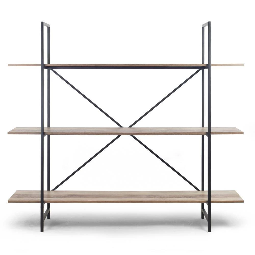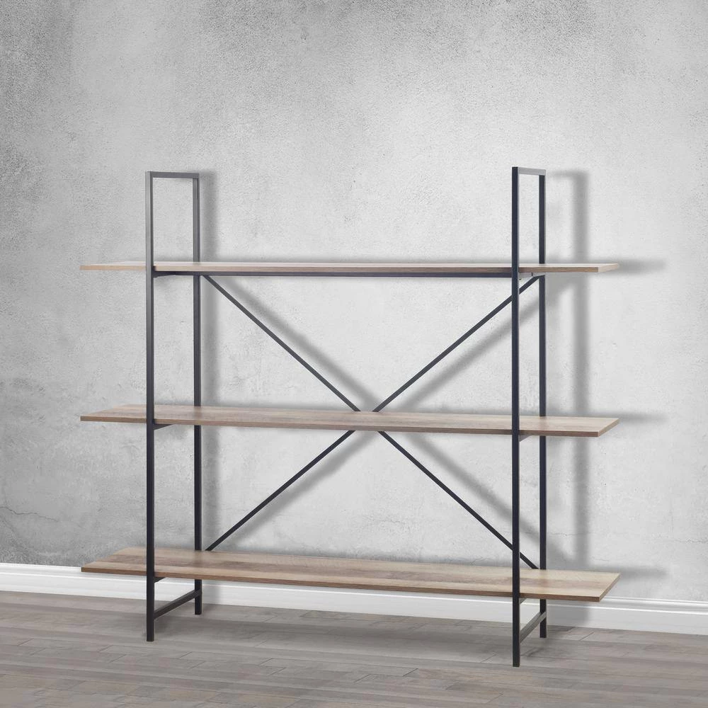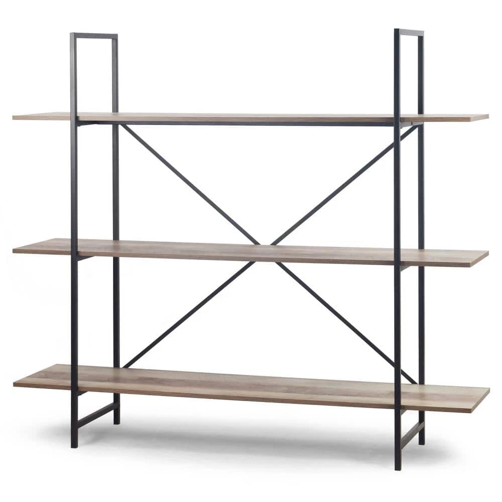 Chic, simple, and versatile, this etagere bookcase has it all. Simple lines create a modern industrial look, and add style to your room. Black frame and weathered oak finish shelves form a neutral color palette that will fit any room. Three full shelves provide generous organization space. Frame of this etagere is made of metal, and its shelves are made of quality particle board with 3D veneer. This is a free standing book shelf, and it could also be used as a room divider. Assembly is needed. Wipe clean with dry cloth recommended. Features: Free standing shelf Shelves made of particle board with 3D veneer Weathered oak finish shelves Black metal frame Three full shelves Assembly needed Assembly required Product Dimensions: 63 in. W in. x 15.75 in. D in. x 56 in. H Weight: 59.53 lbs. Shelf: 63 in. W in. x 14.25 in. D in. x 0.625 in. thick; Clearance between shelves: 18.875; Legs: 2.5 in. H; Distance between metal frames: 43.875 in. W.