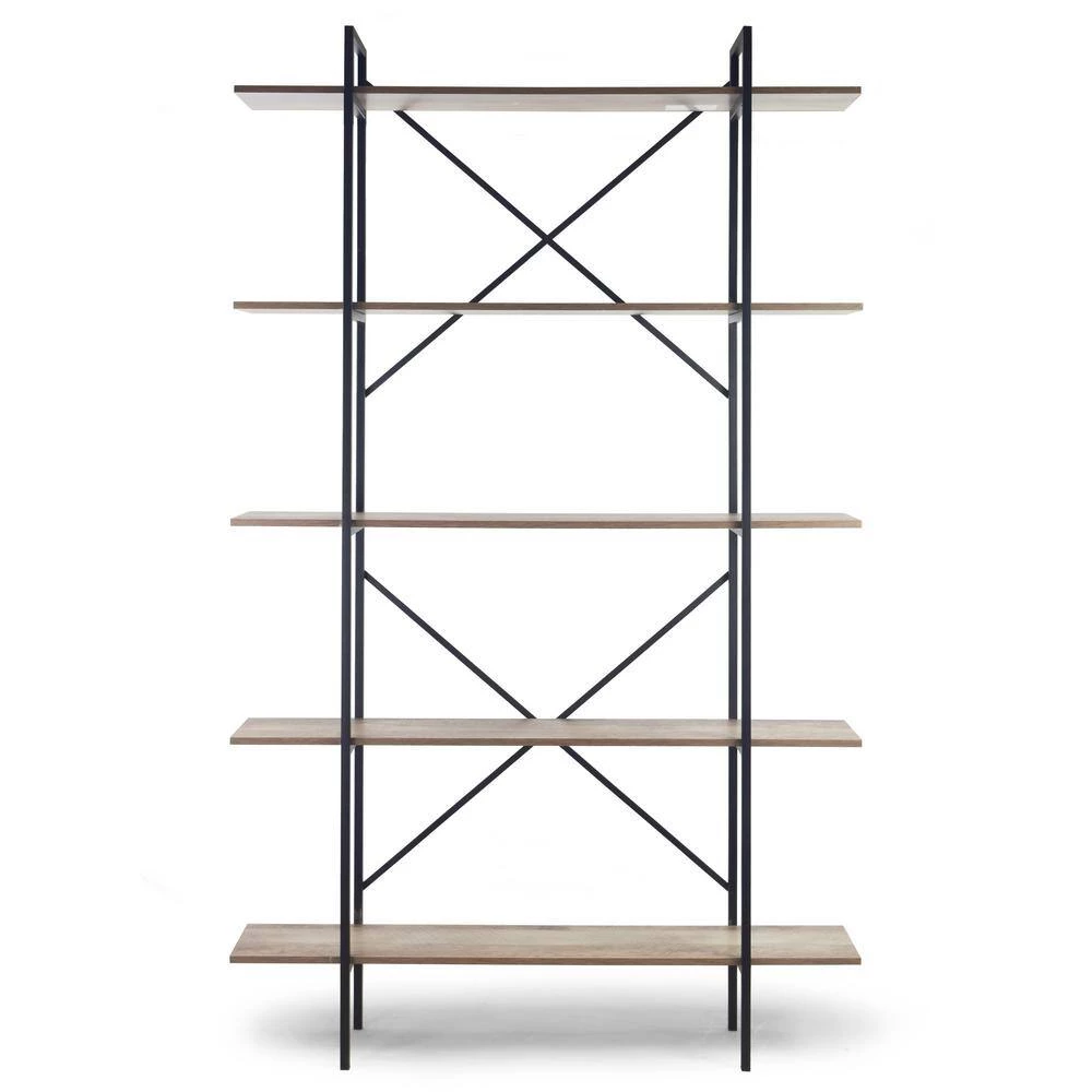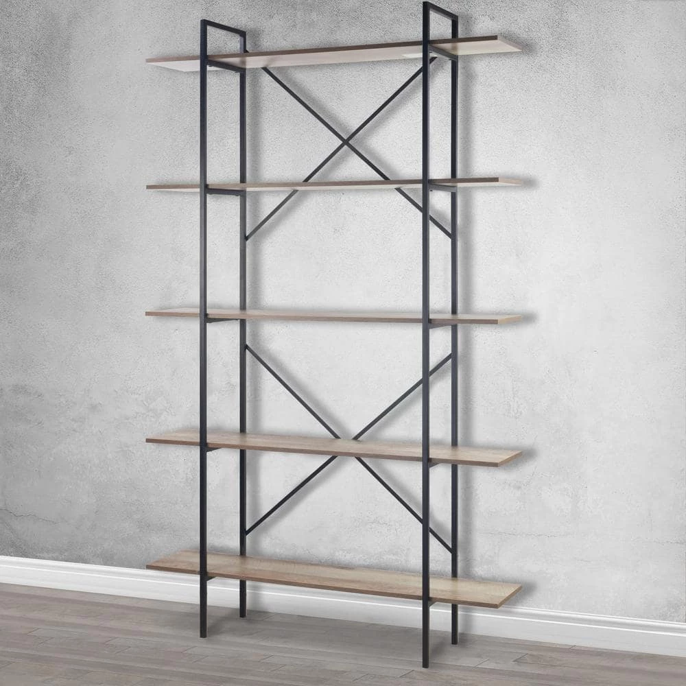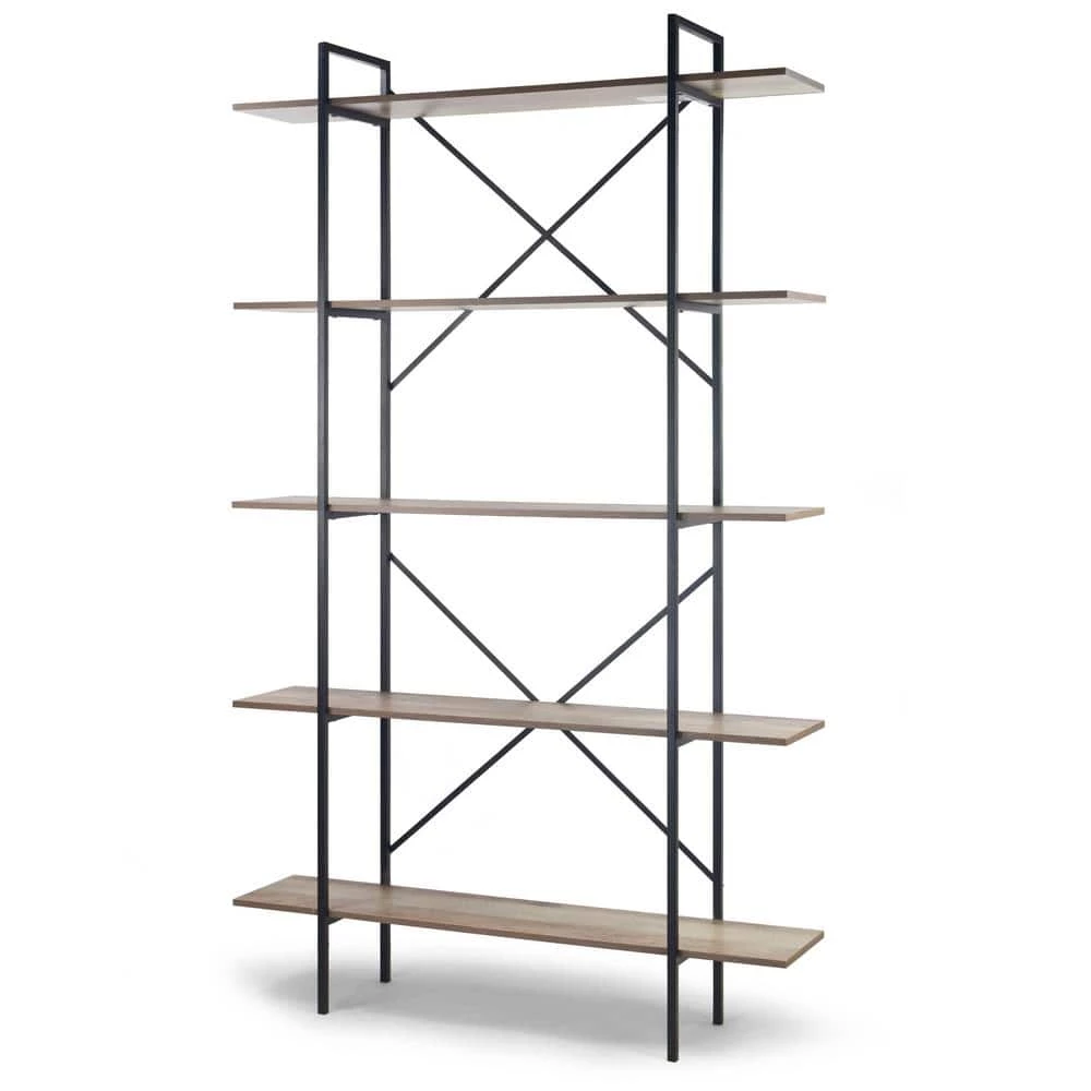 Chic, simple, and versatile, this etagere bookcase has it all. Simple lines create a modern industrial look, and add style to your room. Black frame and weathered oak finish shelves form a neutral color palette that will fit any room. Five full shelves provide generous organization space. Frame of this etagere is made of metal, and its shelves are made of quality particle board with 3D veneer. This is a free standing book shelf, and it could also be used as a room divider. Assembly is needed. Wipe clean with dry cloth recommended. Features: Free standing shelf Shelves made of particle board with 3D veneer Weathered oak finish shelves Black metal frame Five full shelves Assembly needed Assembly required Product Dimensions: 51.25 in. W in. x 12.25 in. D in. x 84.75 in. H Weight: 63.94 lbs. Shelf: 51.25 in. W in. x 10.75 in. D in. x 0.625 in. thick; Clearance between shelves: 17 in. H; Distance between metal frame: 31.5 in. W; Legs: 8 in. H.