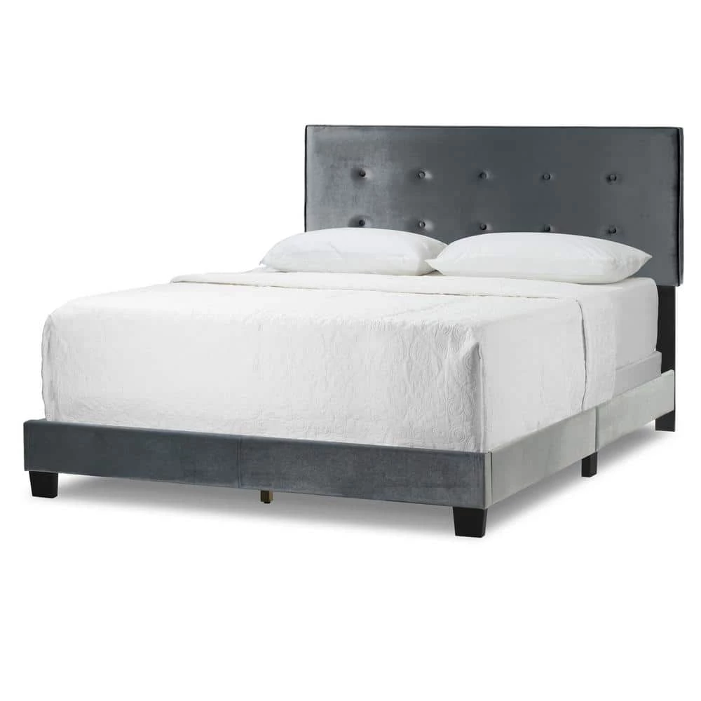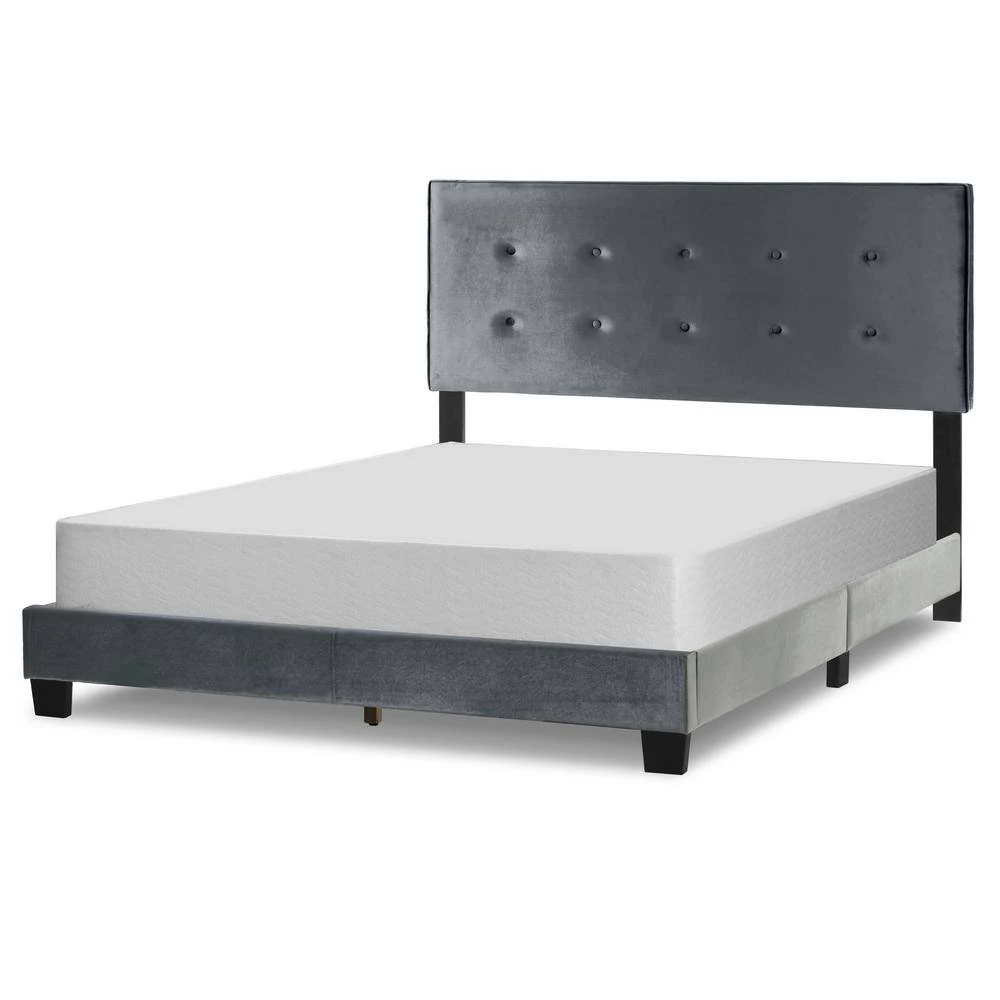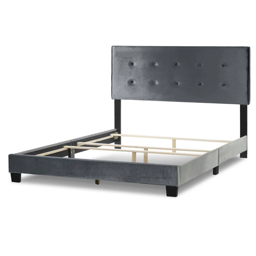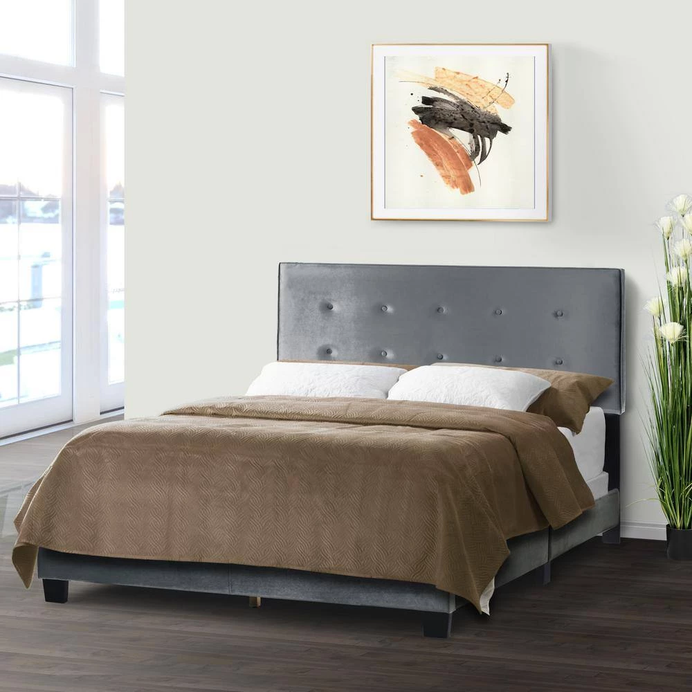 A simple design yet with carefully crafted details. Unique silver grey velvety fabric upholstery will surely make this bed the center piece of your bedroom. Bed frame made of rubber wood offers quality and stability, while button tufting and decorative piping on the headboard add style elements. This bed ships fast and all parts come in one box. The bed frame comes with center support legs, and a box spring is required for use. Assembly required. Spot clean recommended.