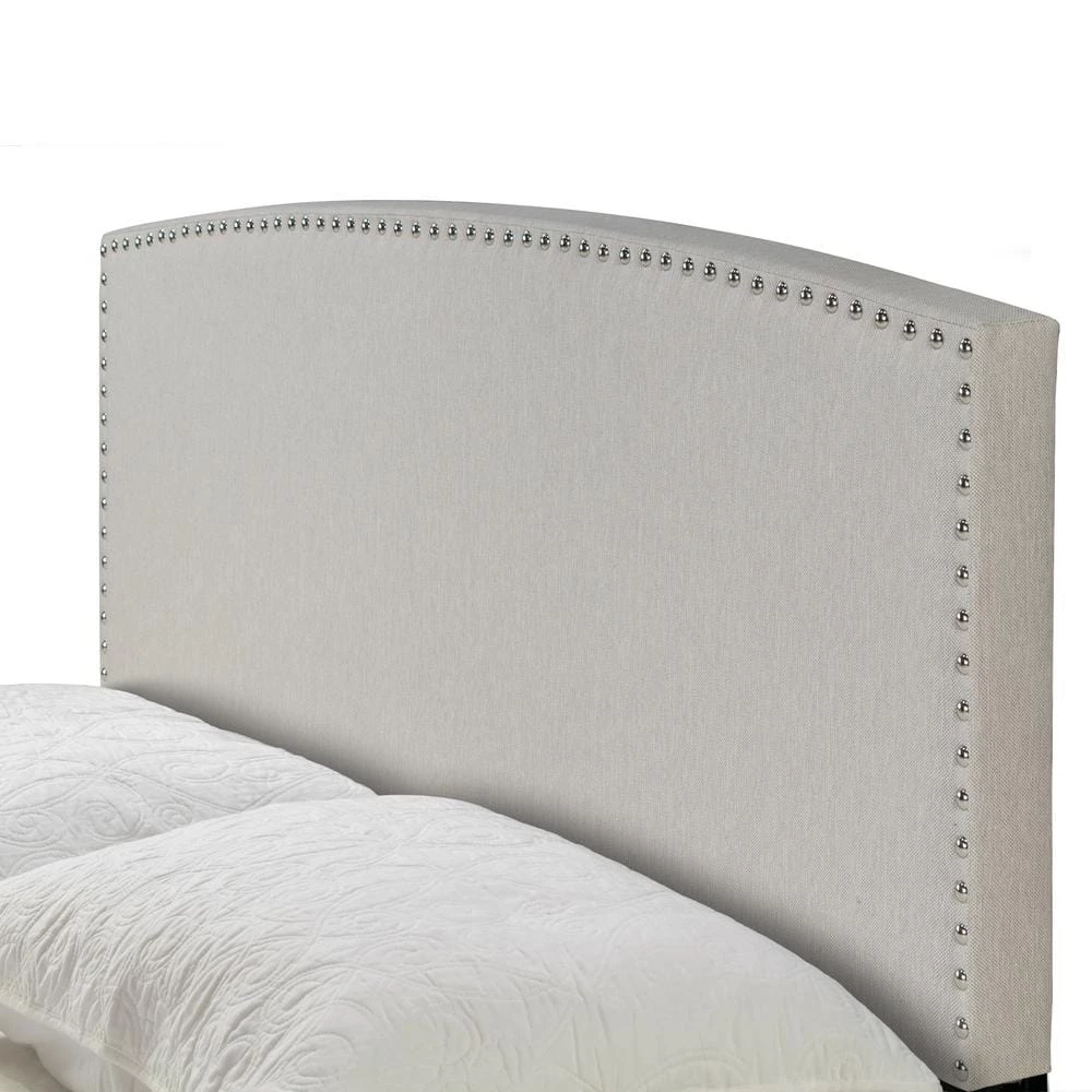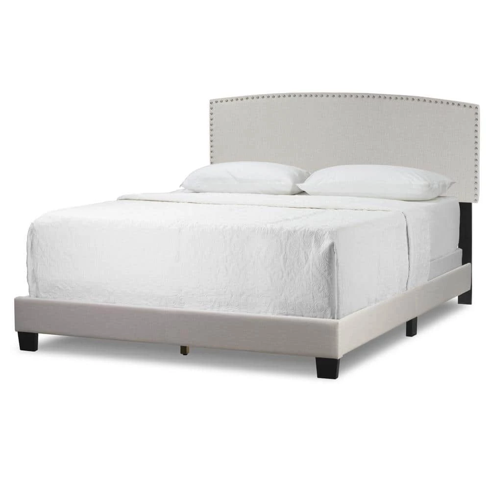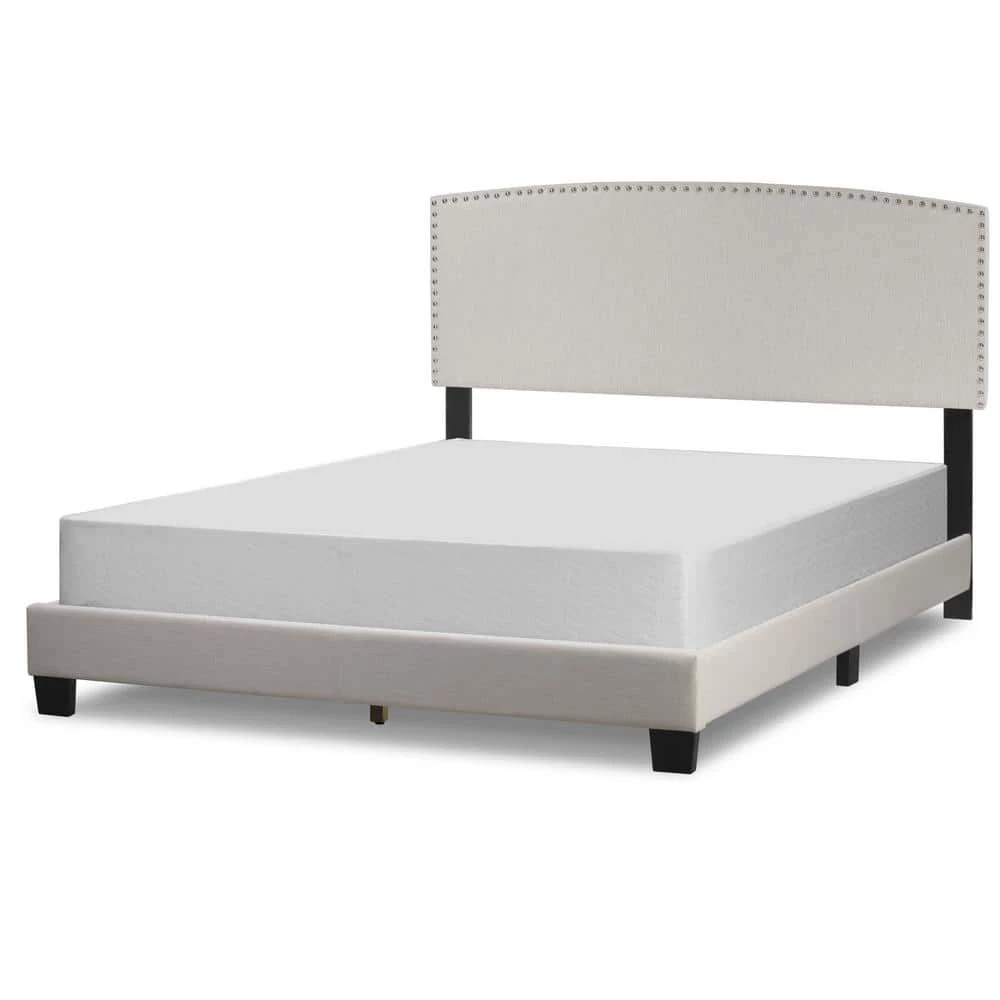 This bed frame is a classic design with updated modern details. Neutral color scheme will beautifully match other pieces in your bedroom. The bed frame and inside support pieces are made of rubber wood. It is a simple bed yet the nail head trim on the headboard adds characteristics. This bed ships fast and all parts come in one box. You will need a box spring for better support of your mattress. Assembly required. Spot clean recommended.