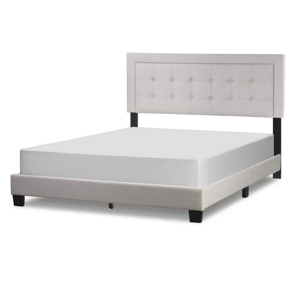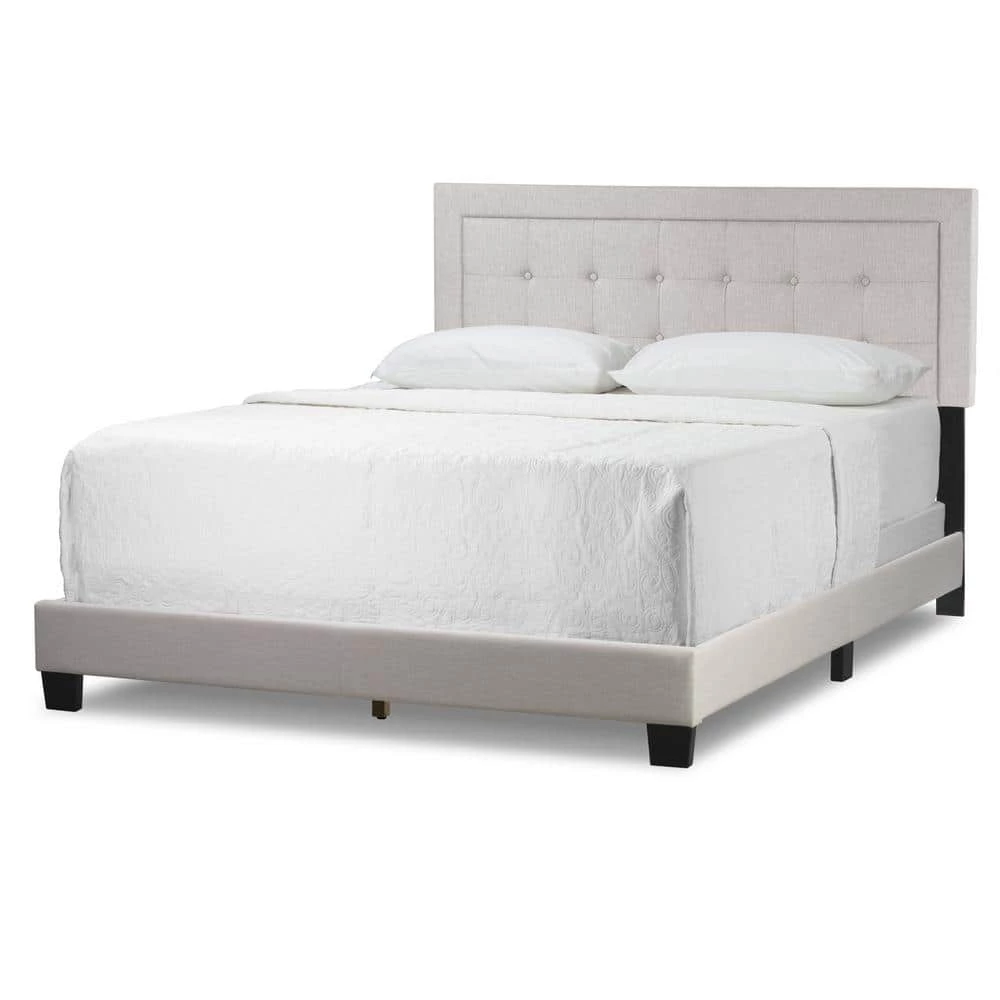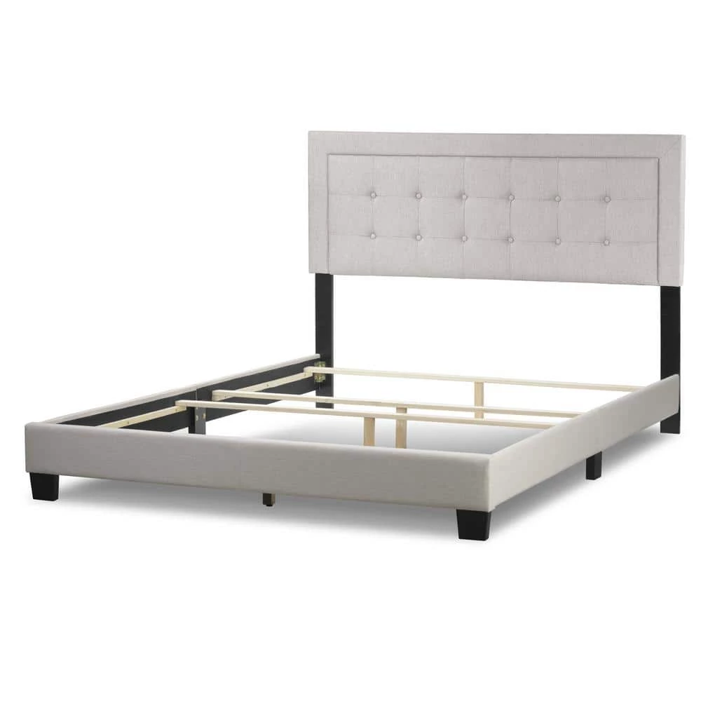 This is a modern bed design with carefully crafted details. Neutral color scheme of this bed will easily match other pieces in your bedroom and lighten up your decor. Bed frame and inside support pieces of this bed are made of rubber wood. Headboard is decorated with button tufting and stitching across. This bed ships fast and all parts come in one box. The bed frame comes with center support legs, and a box spring is required for use. Assembly required. Spot clean recommended.