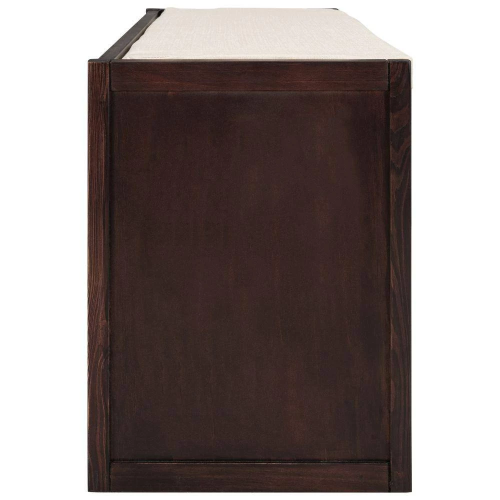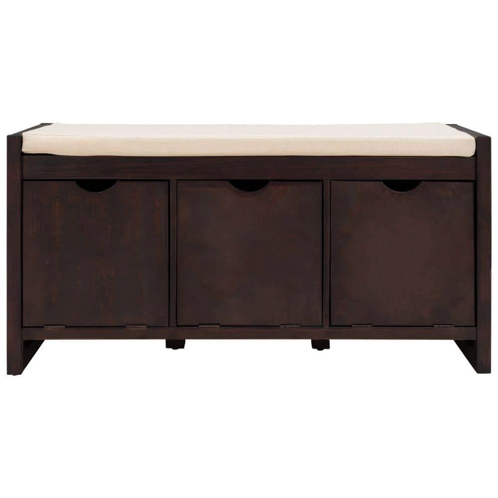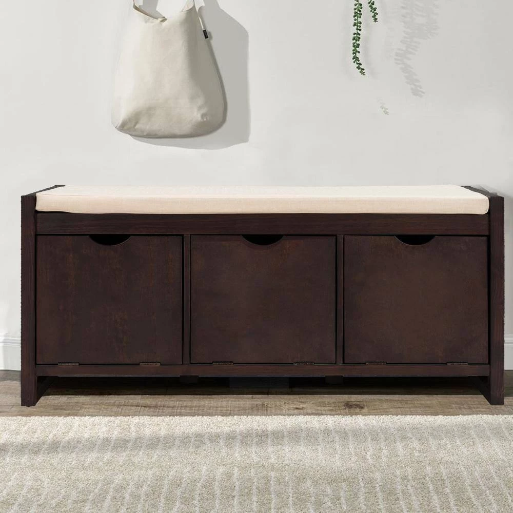 Ideal for family use, this classic bench functions as the perfect inconspicuous storage option to tastefully store your personal belongings. Combine the neutral finish and 3 roomy storage cubbies, this storage bench give your home an inviting look. Fitting perfectly into any space like entryway, living room and balcony. Manufactured from pine wood frame with beautiful distressed finish, this bench is built to last and has solid stability that can withstand heavy weight with ease. Two solid wood legs under the bench help to anhance the solid feel and adjustable feet at the bottom help to support. Removable linen blend cushion provides maximum comfort and relaxation to this storage bench. Also, the cushion seating is easy to remove and clean. This bench is designed to resist humidity while also making it easy to spot clean for dust. Feature with 3 storage cubbies which doors are flip action lock. Both the top arc-shaped vacancy and the inside door magnet help you avoid trouble when you use it. Use 3 cubbies to organize your shoes, books and others.