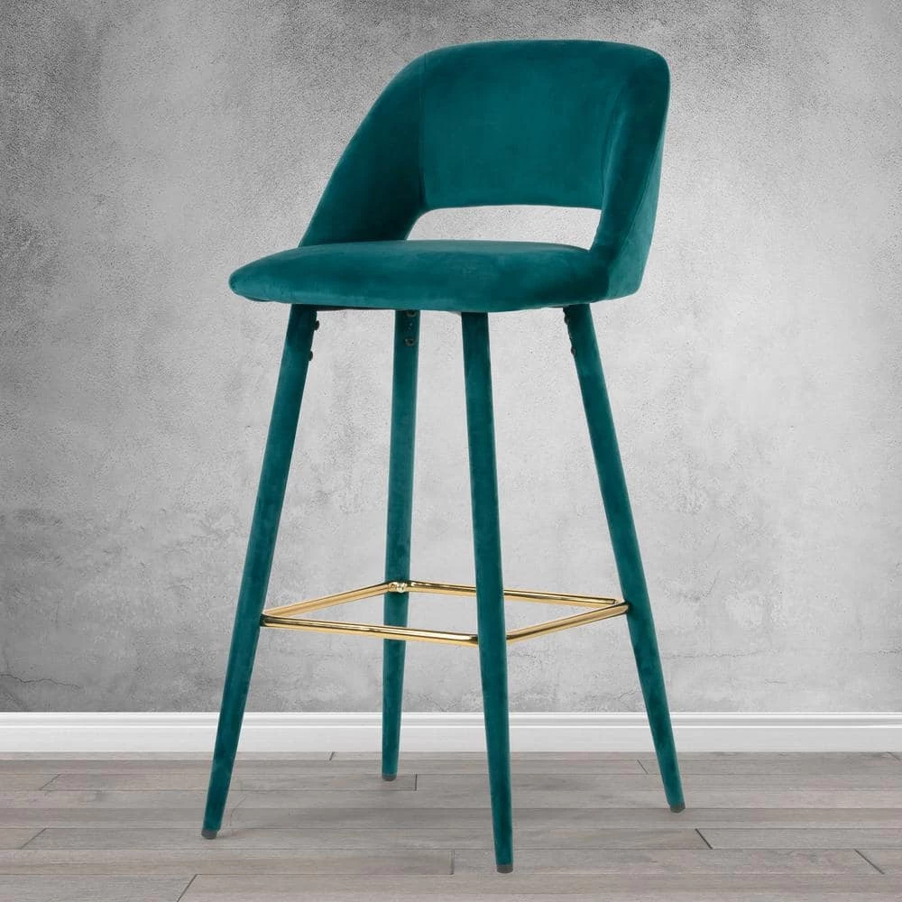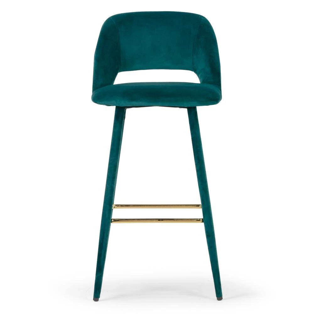 This Bar Stool can surely become a conversation piece of your room. Both the seat and legs are upholstered with teal velvety fabric, making this stool uniquely chic. Gold brushed metal footrest adds contrast and modern delicacy. Steel legs and frame ensure years of use and comfort. Minor assembly needed. Spot clean recommended.