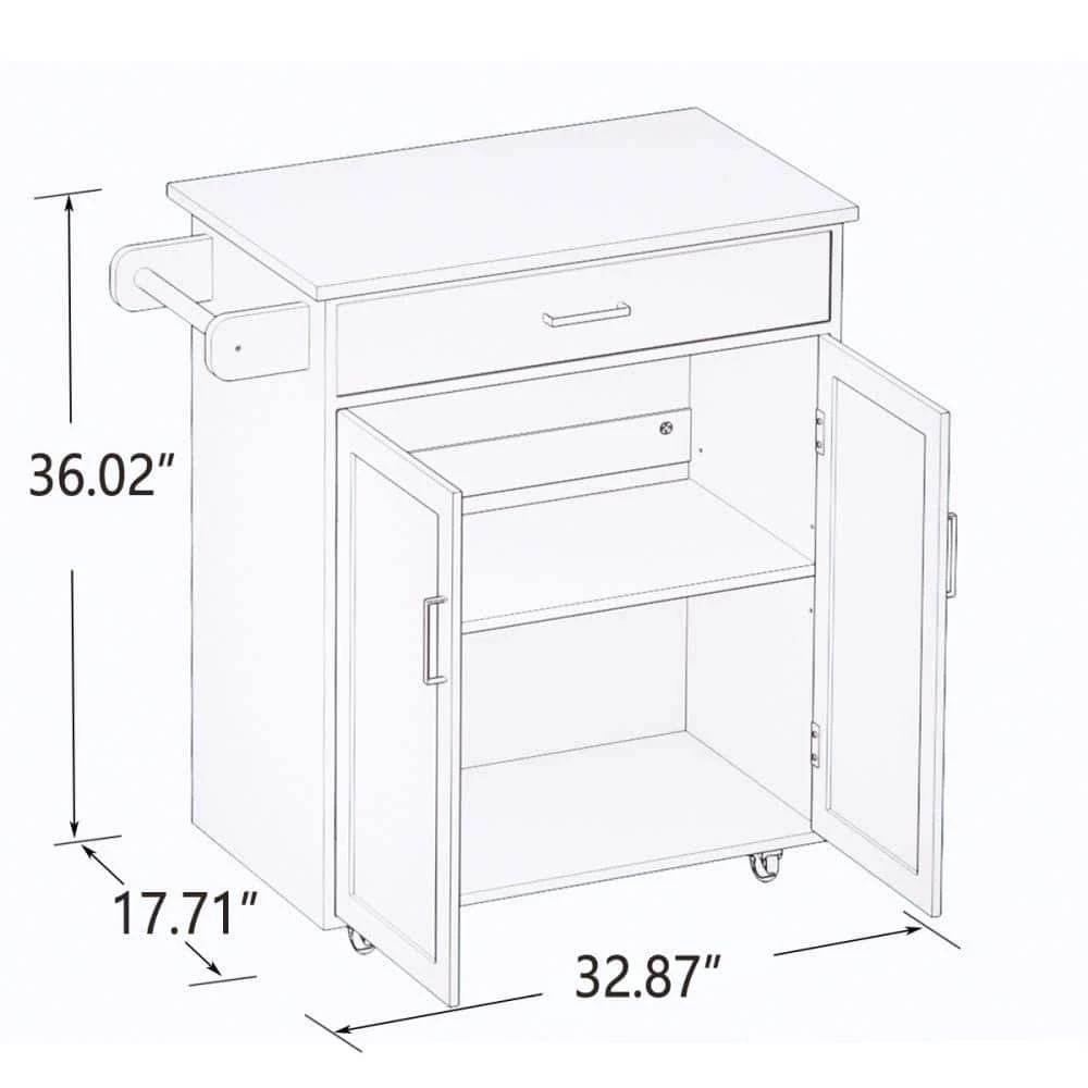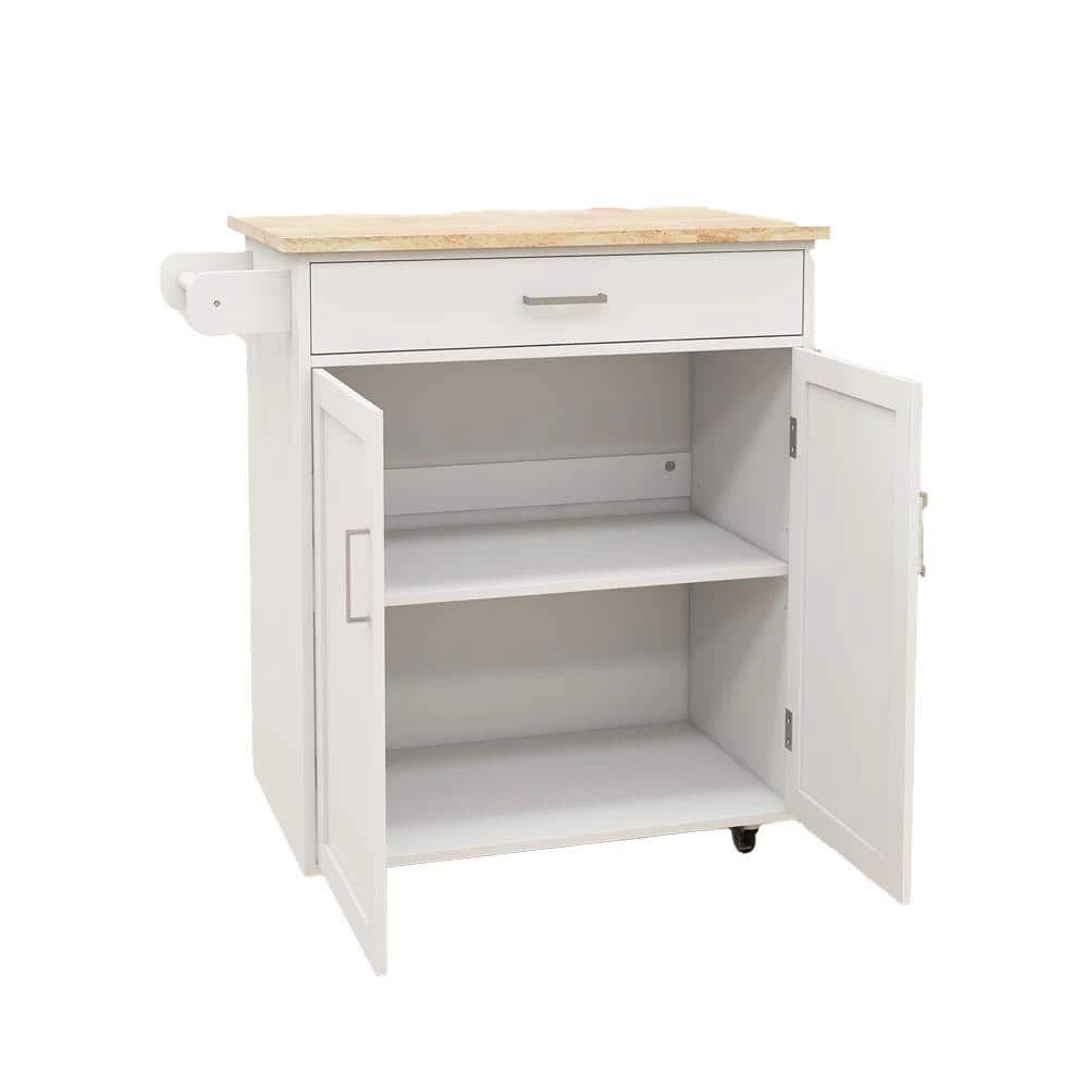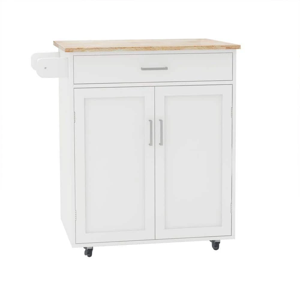 This is really a very convenient Kitchen island rolling trolley cart! This kitchen island is made of high quality MDF board and a solid rubber wood table top, sturdy and stable for many years of cooking. Ample space to put everything you need for the kitchen, equipped with one drawer, double doors and a solid rubber wood countertop, provide enough storage space for you. Casters allows you move this kitchen cart to wherever you want it placed, two of them are lockable when you need to make it fixed. This white kitchen island has a towel rack on one side, you can easily pick up kitchen towel or tissue, it also can be used as a handle when you move this cart.