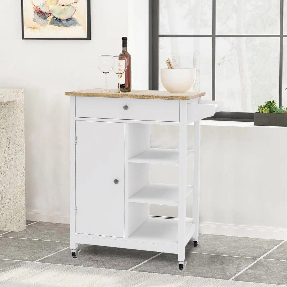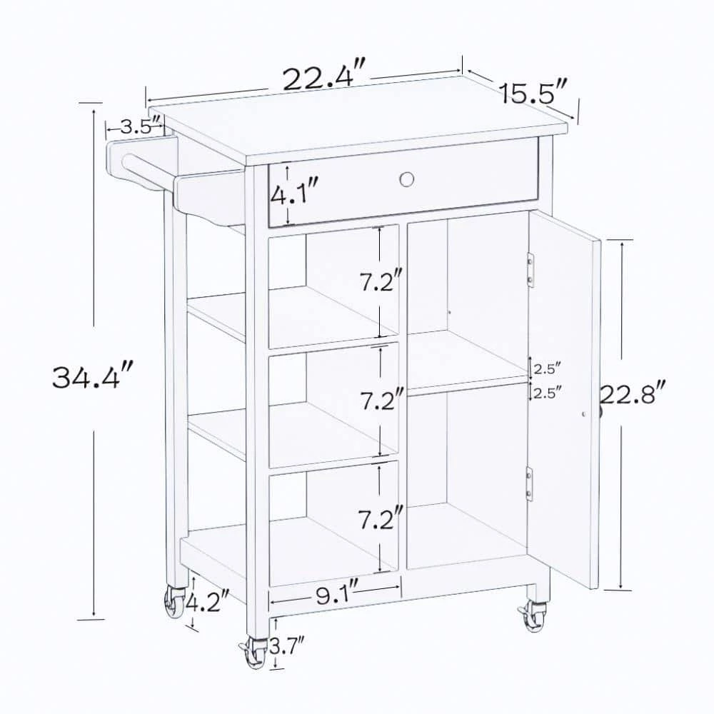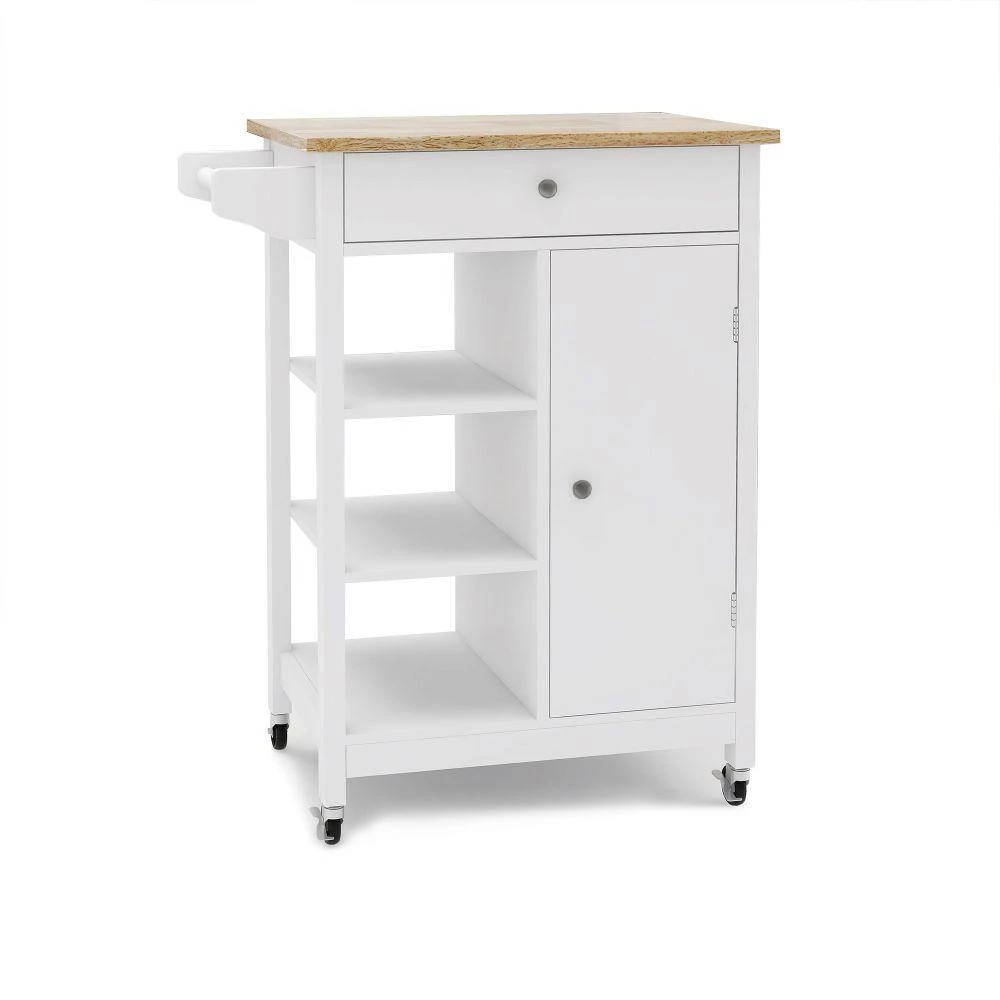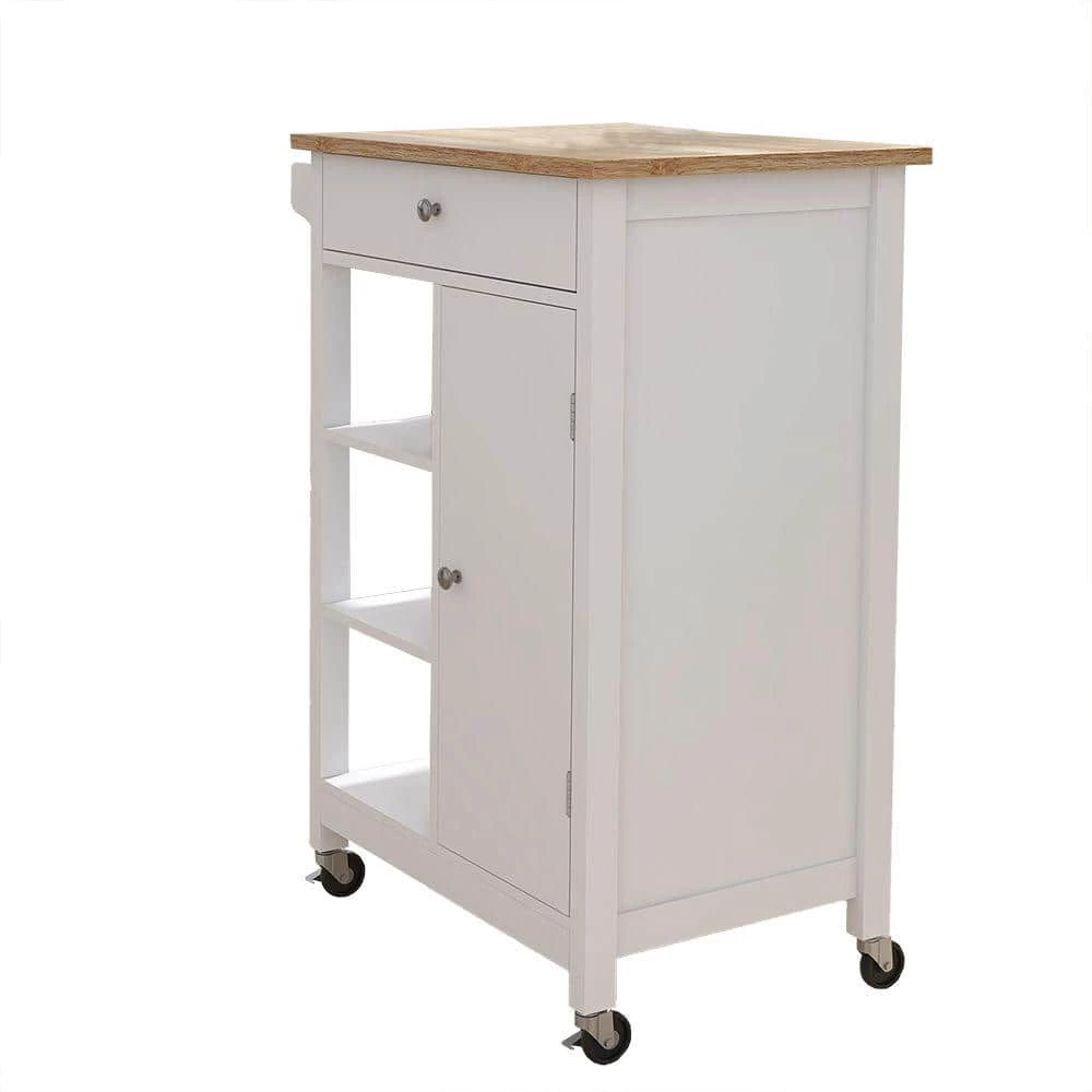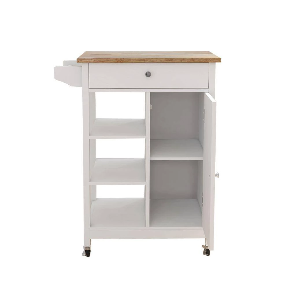 This is really a very convenient kitchen rolling cart! This kitchen island is made of high quality MDF board and a solid rubber wood table top, sturdy and stable for many years of cooking. Casters allows you move this kitchen cart to wherever you want it placed, two of them are lockable when you need to make it fixed. This white kitchen island has a towel rack on one side, you can easily pick up kitchen towel or tissue, it also can be used as a handle when you move this cart. Ample space to put everything you need for the kitchen, equipped with one drawer, one door and a solid rubber wood countertop, provide enough storage space for you. Open area for extra storage and easy to get things.